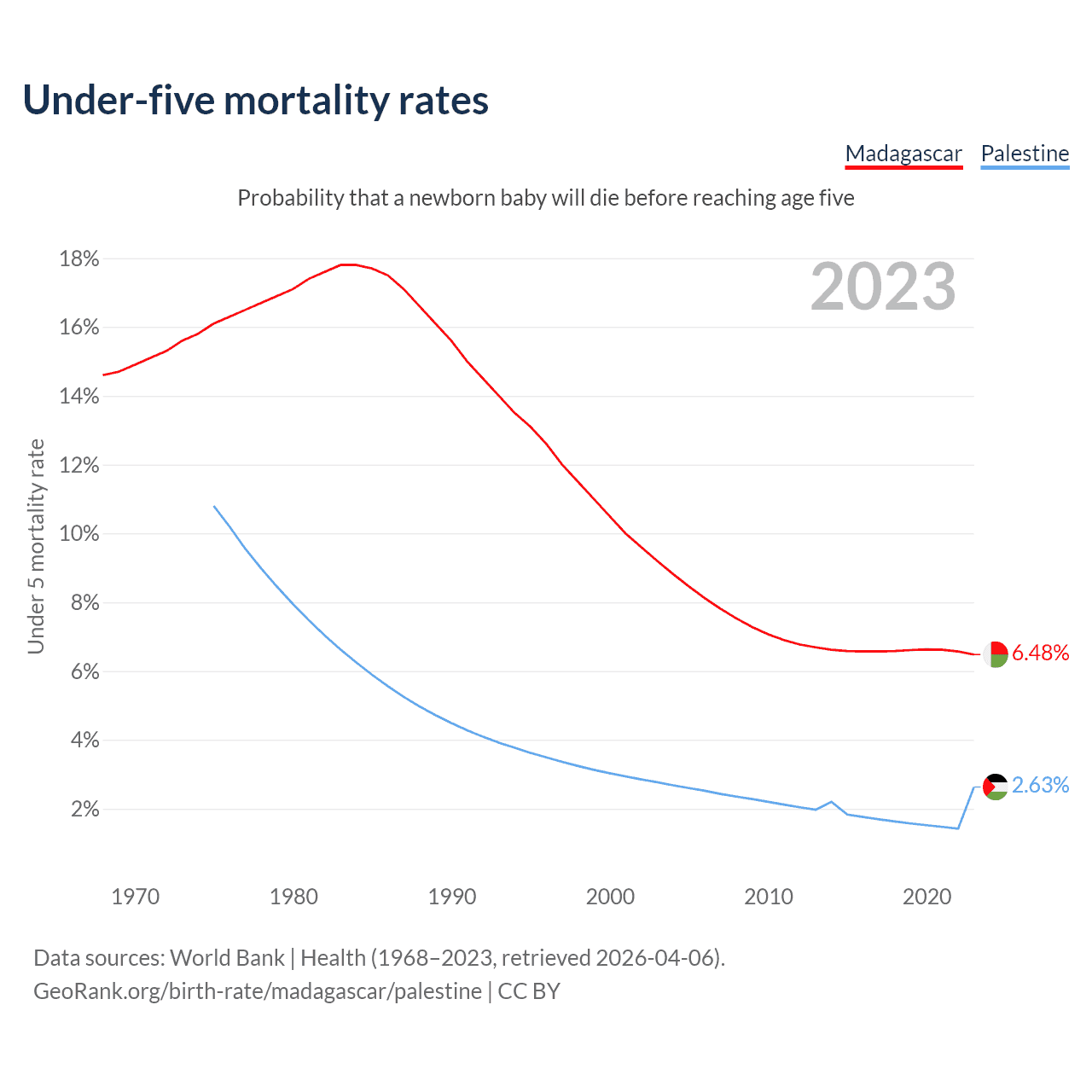 The chance that a newborn baby will die before reaching age five is 6.48% in Madagascar and 2.63% in Palestine. Above is a chart with historical data on under-five mortality rates.
