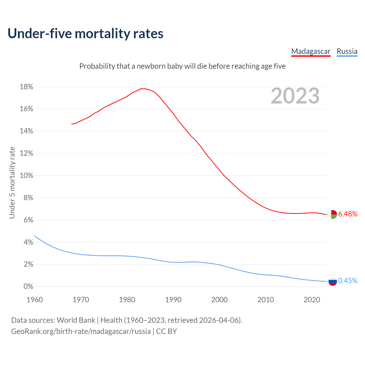 The chance that a newborn baby will die before reaching age five is 6.48% in Madagascar and 0.45% in Russia. Above is a chart with historical data on under-five mortality rates.