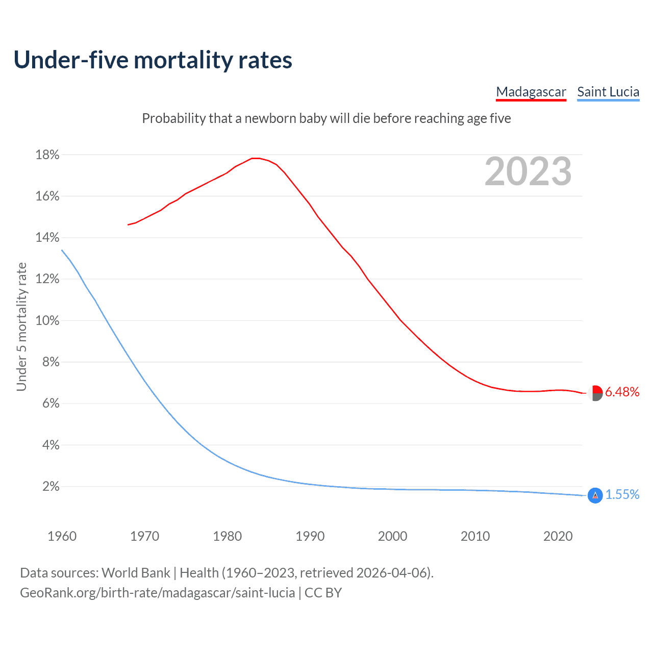 The chance that a newborn baby will die before reaching age five is 6.48% in Madagascar and 1.55% in Saint Lucia. Above is a chart with historical data on under-five mortality rates.