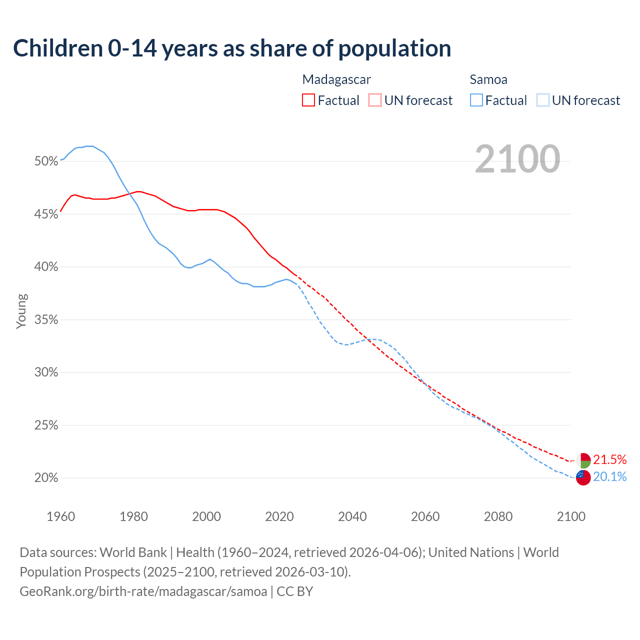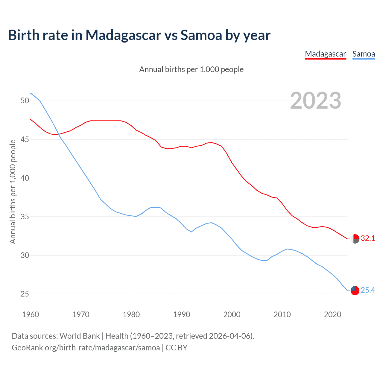 Madagascar has an annual birth rate of 32.1 births per 1,000 people, compared to 25.4 for Samoa. The average number of children a woman is expected to have during her lifetime — the fertility rate, is 3.97 in Madagascar and 3.83 in Samoa — 3.6% difference.