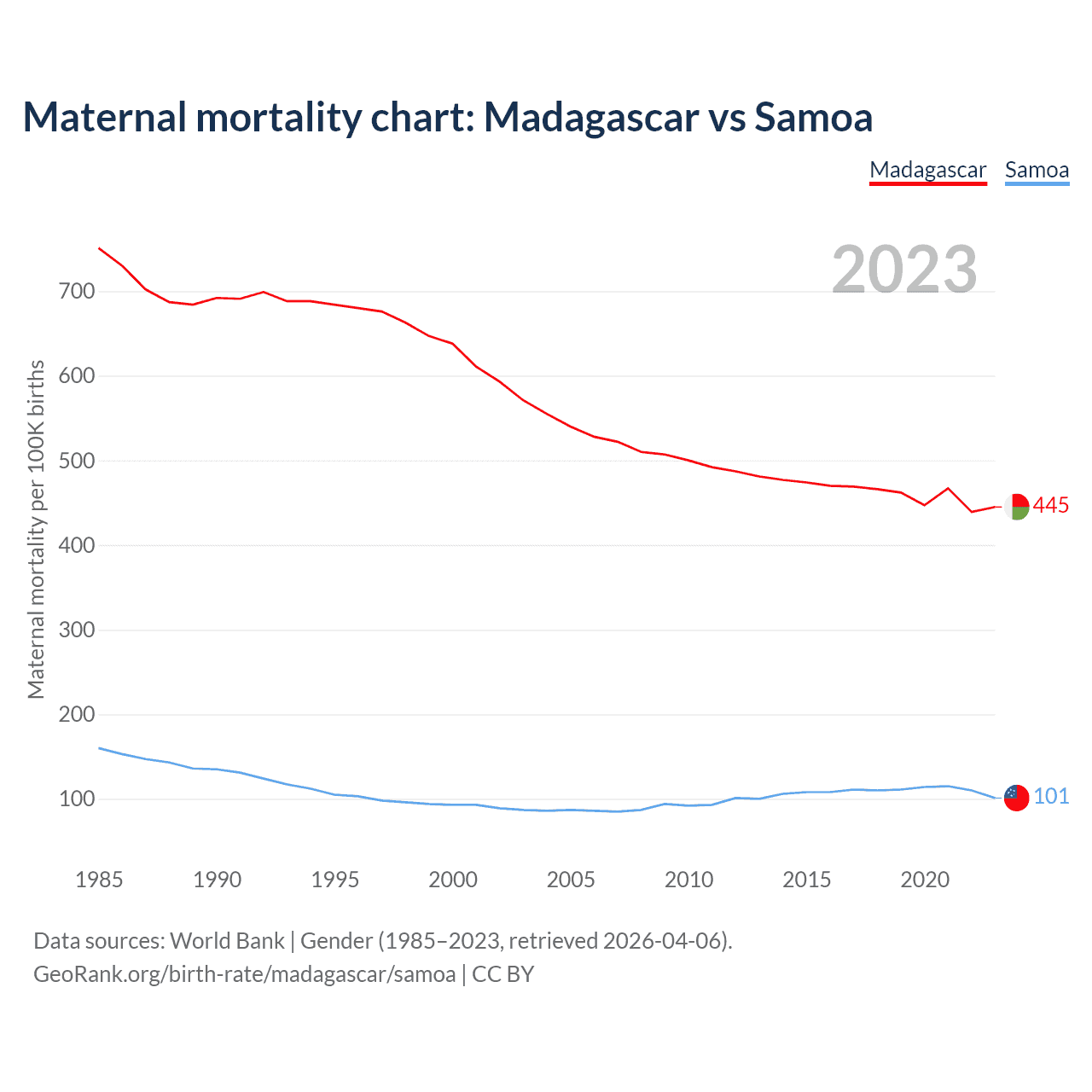 The maternal mortality rate, which is the probability of dying during childbirth or within 42 days of pregnancy termination, is 445 deaths per 100,000 live births in Madagascar, compared to 101 deaths in Samoa.