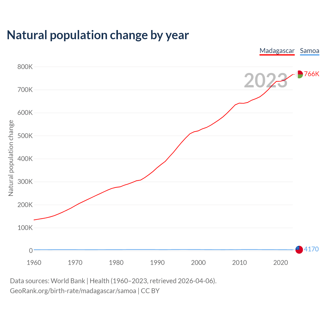 According to the latest available data on birth rates, the fertility rate in Madagascar was 3.97 children per woman in 2023, compared to 3.83 in Samoa in 2023. The replacement level is considered to be 2.1 children per woman.