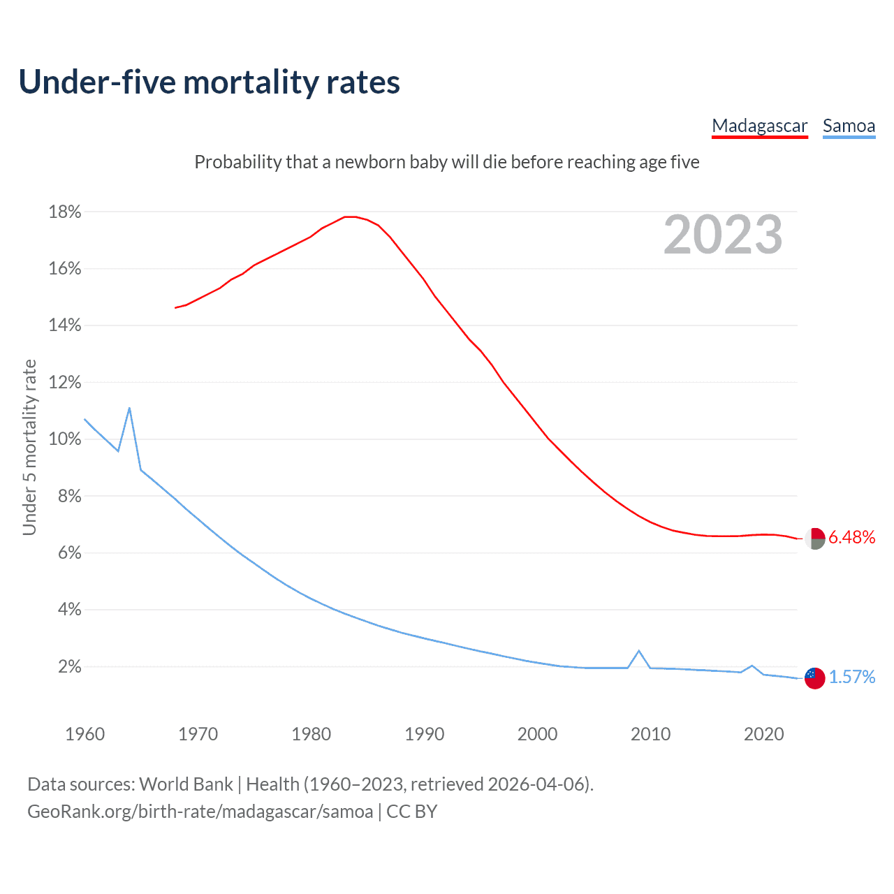 The chance that a newborn baby will die before reaching age five is 6.48% in Madagascar and 1.57% in Samoa. Above is a chart with historical data on under-five mortality rates.