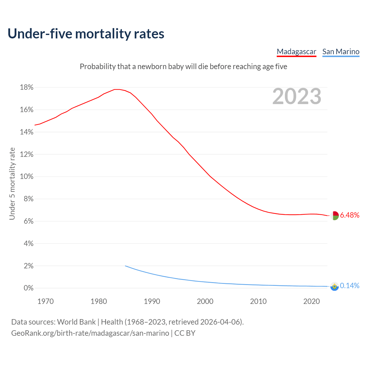 The chance that a newborn baby will die before reaching age five is 6.48% in Madagascar and 0.14% in San Marino. Above is a chart with historical data on under-five mortality rates.