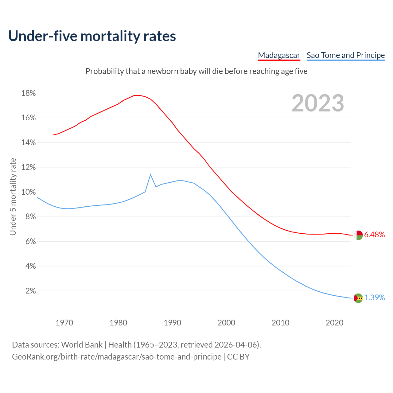 The chance that a newborn baby will die before reaching age five is 6.48% in Madagascar and 1.39% in Sao Tome and Principe. Above is a chart with historical data on under-five mortality rates.