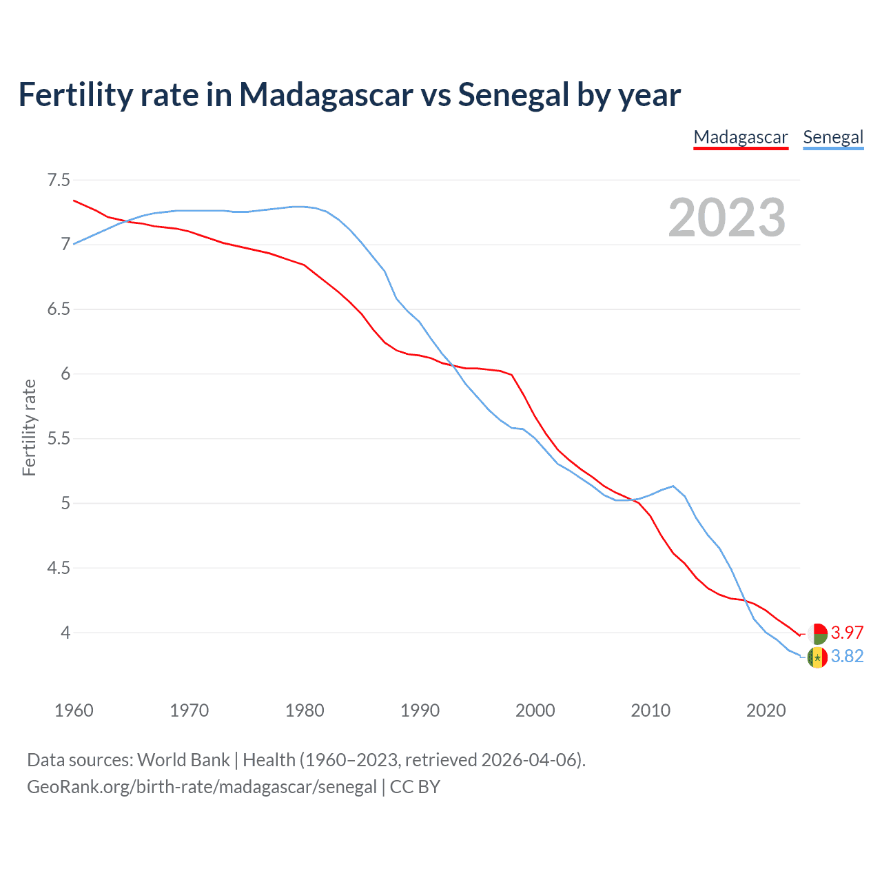 1960 vs 2023, the fertility rate has decreased by 45.9% in Madagascar and by 45.4% in Senegal — in 1960, it was 7.34 and 7, respectively.