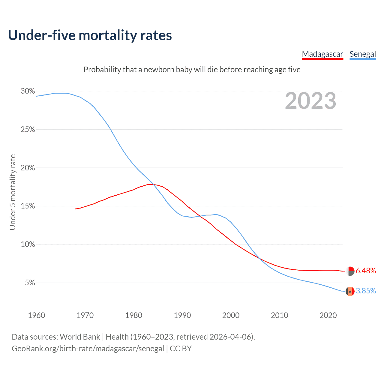The chance that a newborn baby will die before reaching age five is 6.48% in Madagascar and 3.85% in Senegal. Above is a chart with historical data on under-five mortality rates.
