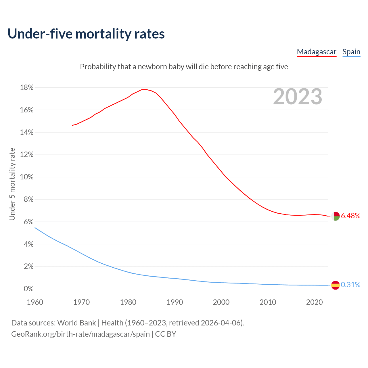 The chance that a newborn baby will die before reaching age five is 6.48% in Madagascar and 0.31% in Spain. Above is a chart with historical data on under-five mortality rates.