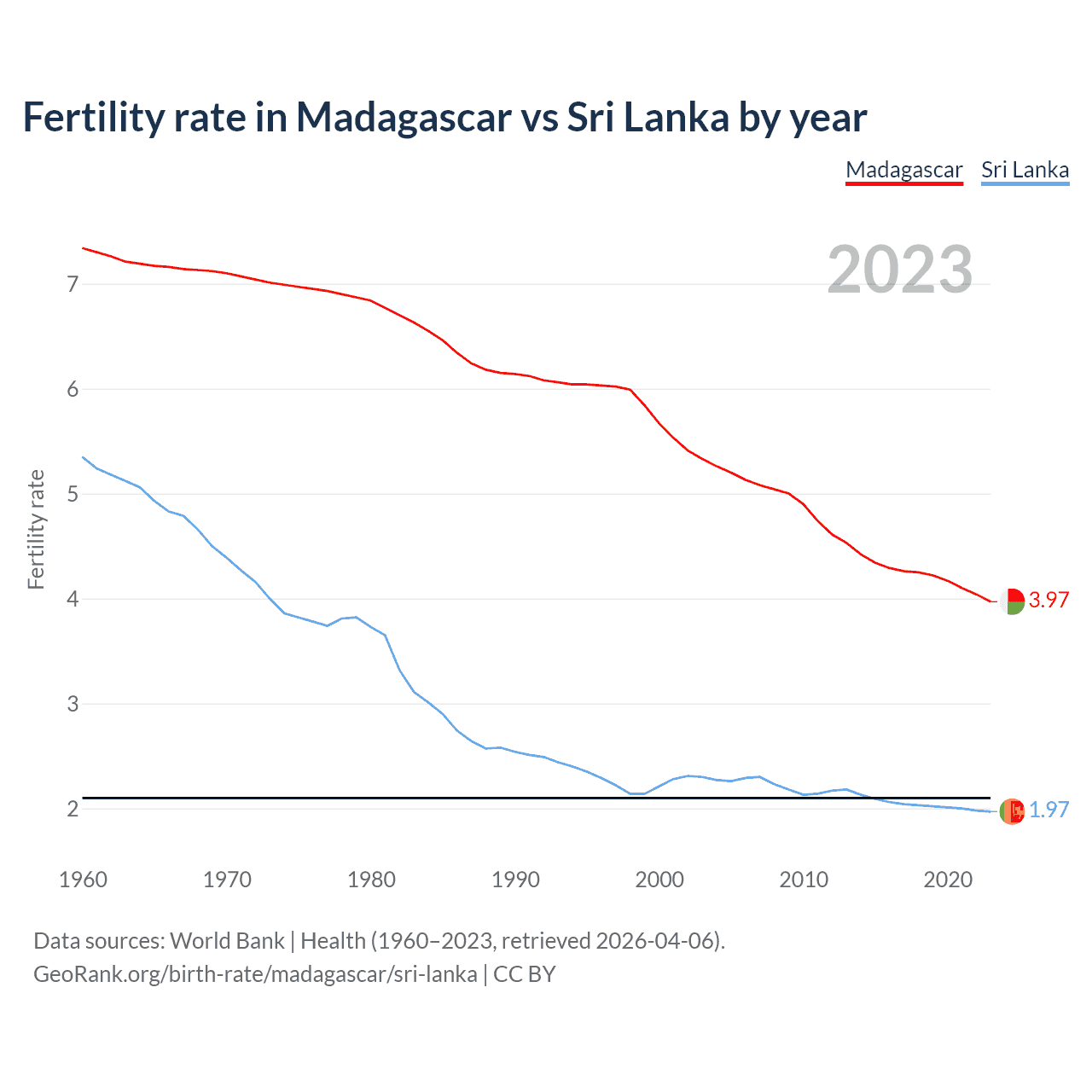 According to the latest available data on birth rates, the fertility rate in Madagascar was 3.97 children per woman in 2023, compared to 1.97 in Sri Lanka in 2023. The replacement level is considered to be 2.1 children per woman.