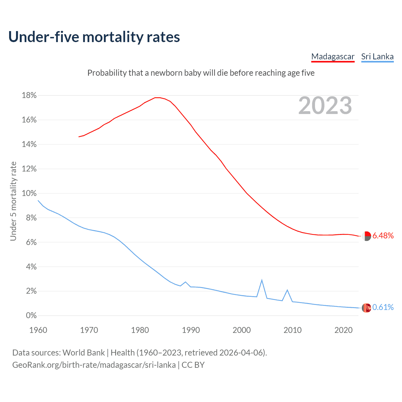 The chance that a newborn baby will die before reaching age five is 6.48% in Madagascar and 0.61% in Sri Lanka. Above is a chart with historical data on under-five mortality rates.