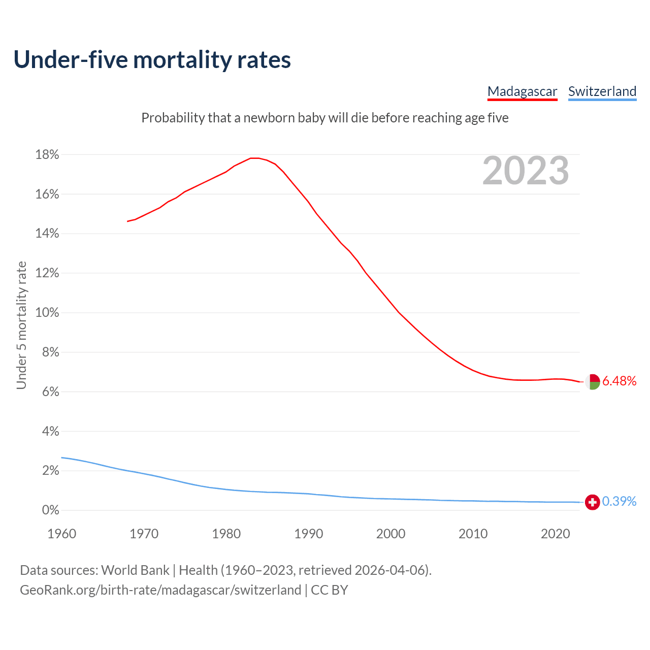 The chance that a newborn baby will die before reaching age five is 6.48% in Madagascar and 0.39% in Switzerland. Above is a chart with historical data on under-five mortality rates.