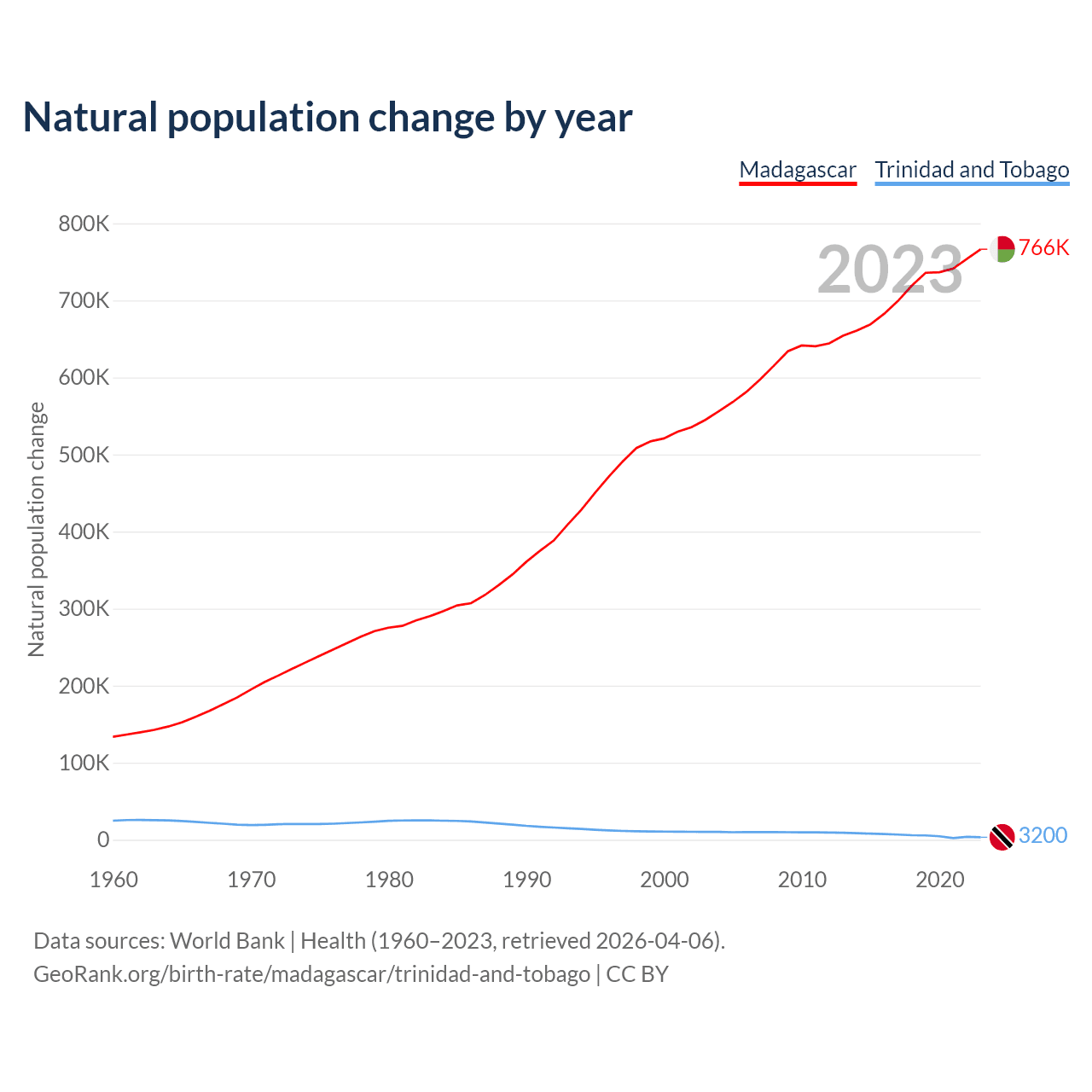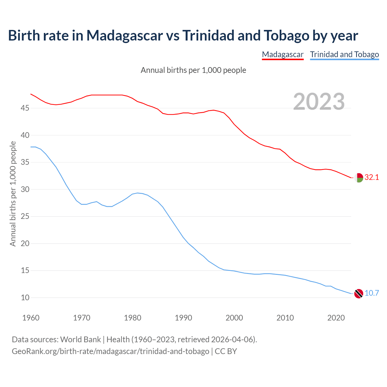Madagascar has an annual birth rate of 32.1 births per 1,000 people, compared to 10.7 for Trinidad and Tobago. The average number of children a woman is expected to have during her lifetime — the fertility rate, is 3.97 in Madagascar and 1.53 in Trinidad and Tobago — 61.4% difference.