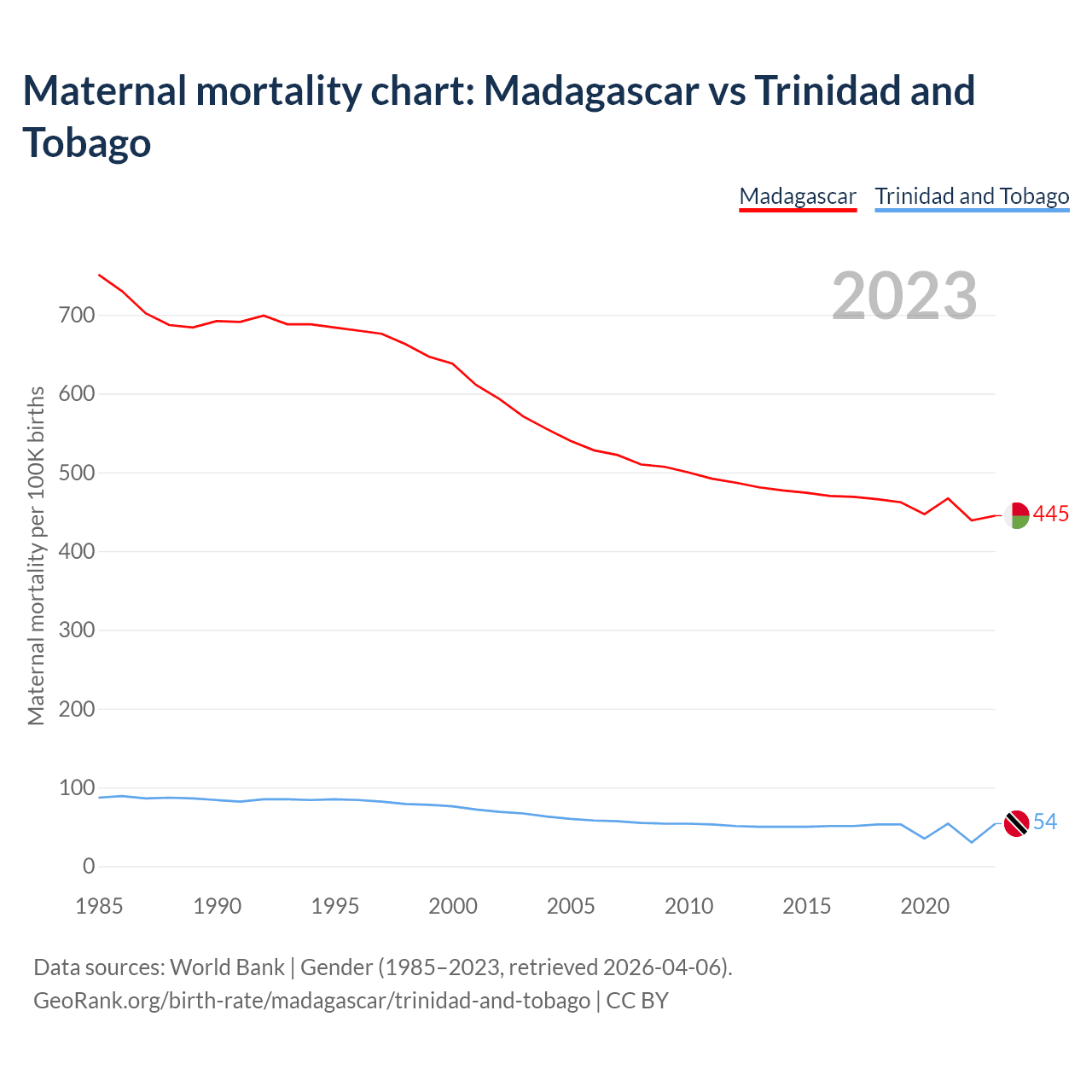 The maternal mortality rate, which is the probability of dying during childbirth or within 42 days of pregnancy termination, is 445 deaths per 100,000 live births in Madagascar, compared to 54 deaths in Trinidad and Tobago.