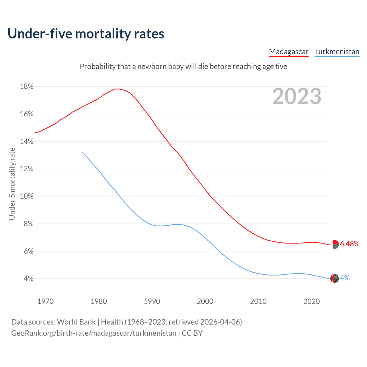 The chance that a newborn baby will die before reaching age five is 6.48% in Madagascar and 4% in Turkmenistan. Above is a chart with historical data on under-five mortality rates.