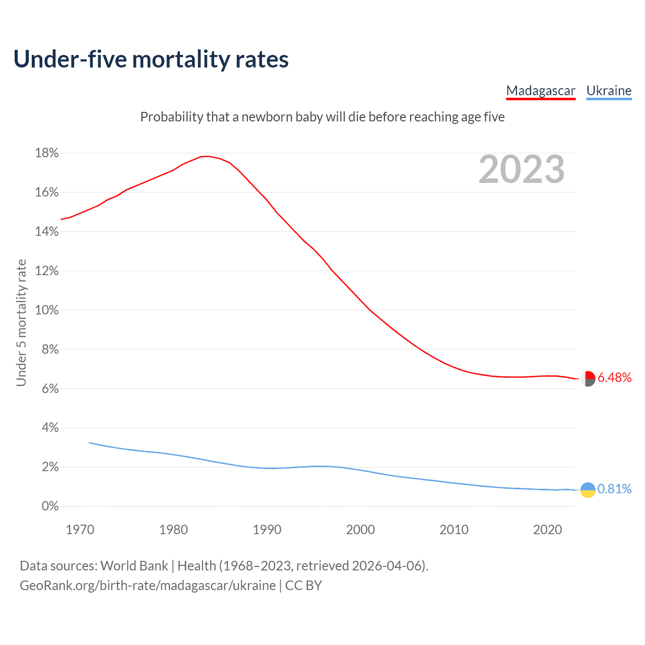 The chance that a newborn baby will die before reaching age five is 6.48% in Madagascar and 0.81% in Ukraine. Above is a chart with historical data on under-five mortality rates.