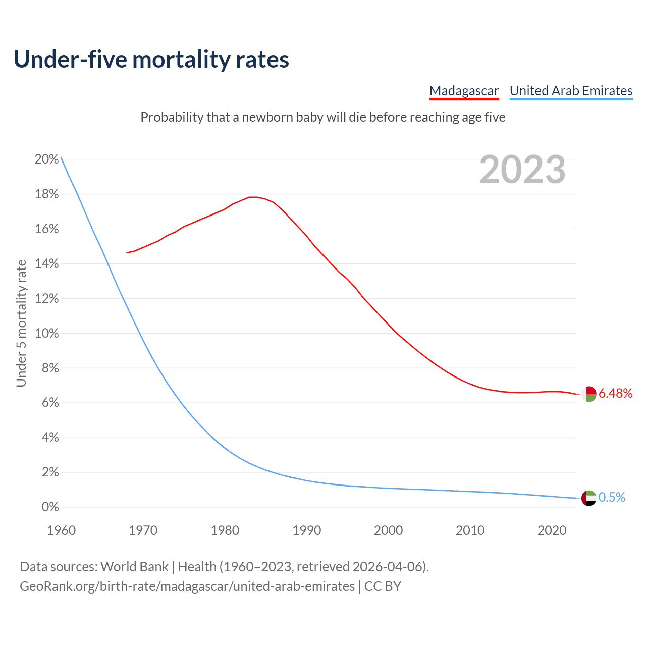 The chance that a newborn baby will die before reaching age five is 6.48% in Madagascar and 0.5% in the United Arab Emirates. Above is a chart with historical data on under-five mortality rates.