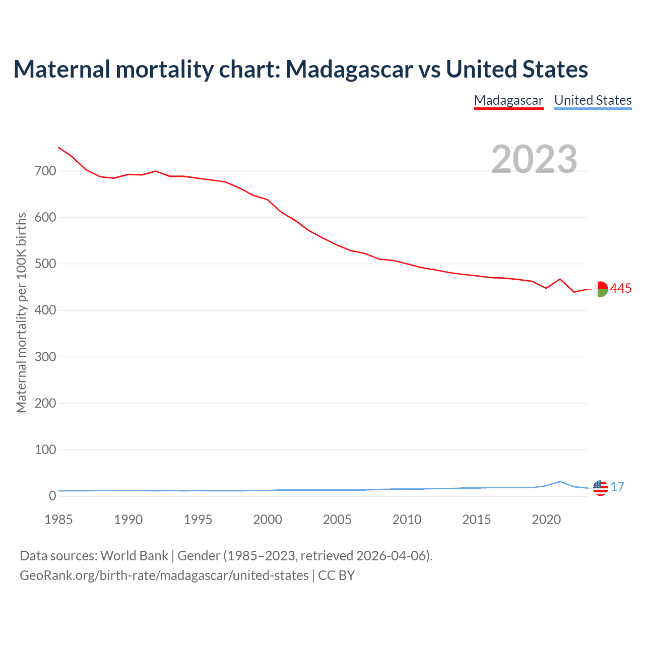 The maternal mortality rate, which is the probability of dying during childbirth or within 42 days of pregnancy termination, is 445 deaths per 100,000 live births in Madagascar, compared to 17 deaths in the United States.
