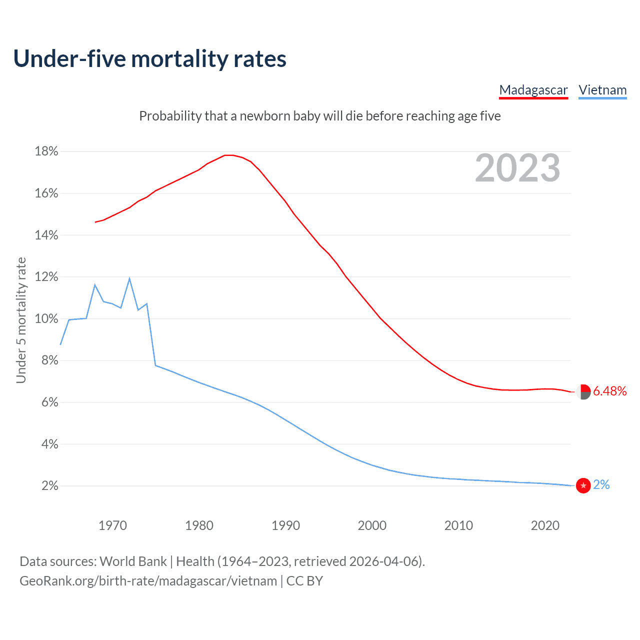 The chance that a newborn baby will die before reaching age five is 6.48% in Madagascar and 2% in Vietnam. Above is a chart with historical data on under-five mortality rates.