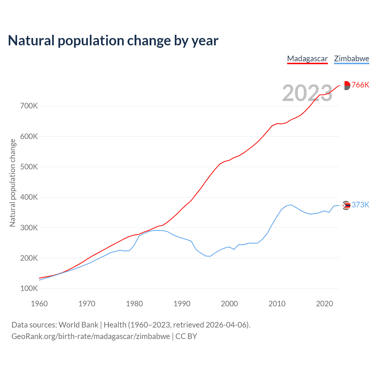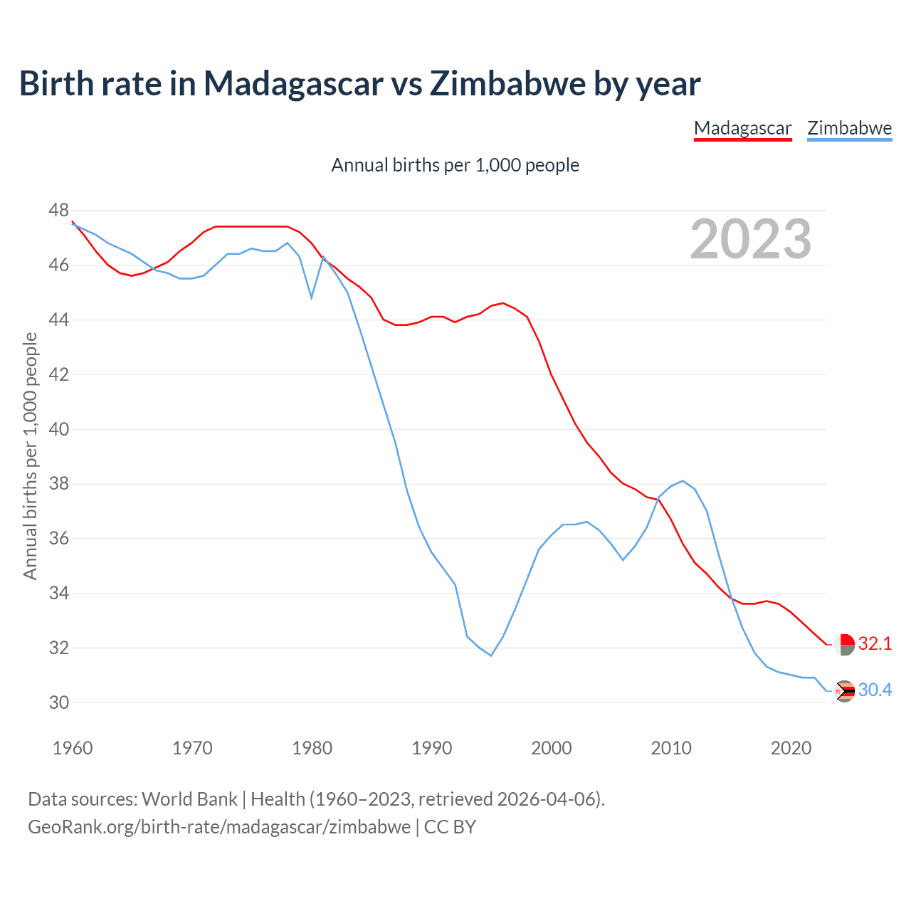 Madagascar has an annual birth rate of 32.1 births per 1,000 people, compared to 30.4 for Zimbabwe. The average number of children a woman is expected to have during her lifetime — the fertility rate, is 3.97 in Madagascar and 3.72 in Zimbabwe — 6.24% difference.