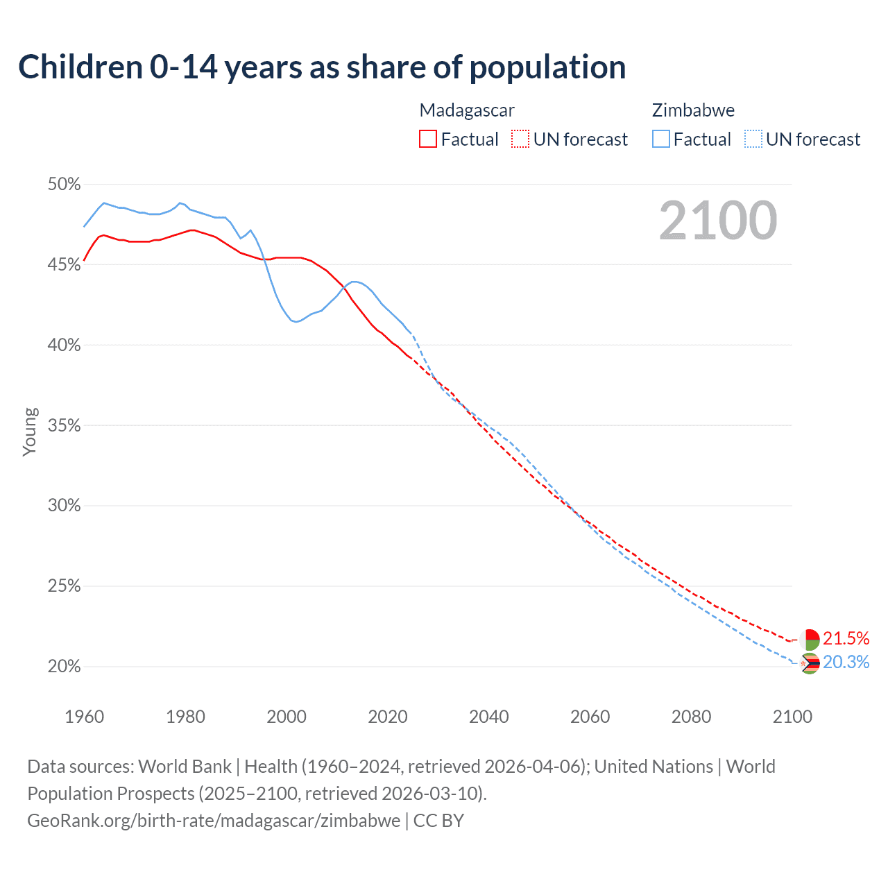 1960 vs 2023, the fertility rate has decreased by 45.9% in Madagascar and by 48.2% in Zimbabwe — in 1960, it was 7.34 and 7.2, respectively.