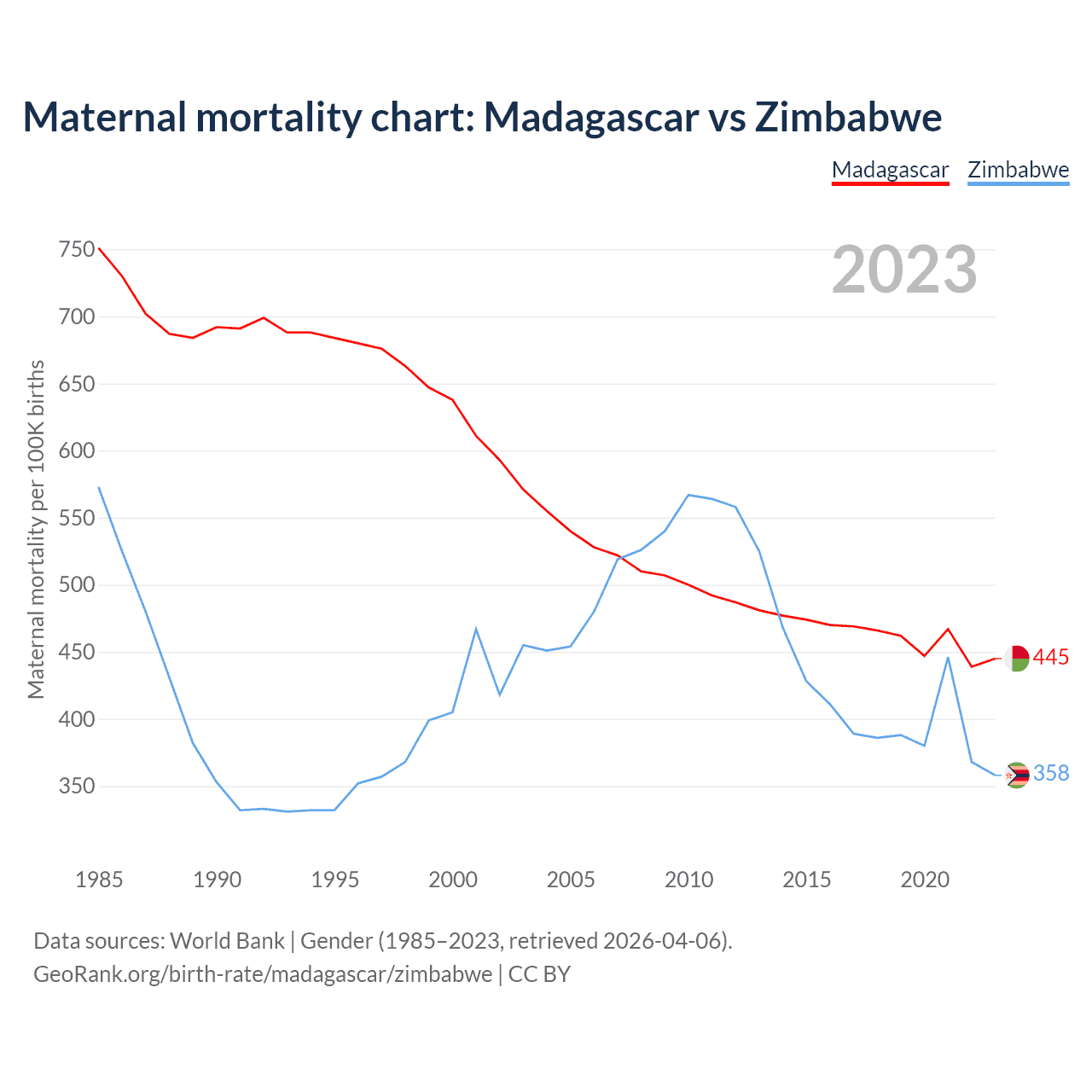 The maternal mortality rate, which is the probability of dying during childbirth or within 42 days of pregnancy termination, is 445 deaths per 100,000 live births in Madagascar, compared to 358 deaths in Zimbabwe.