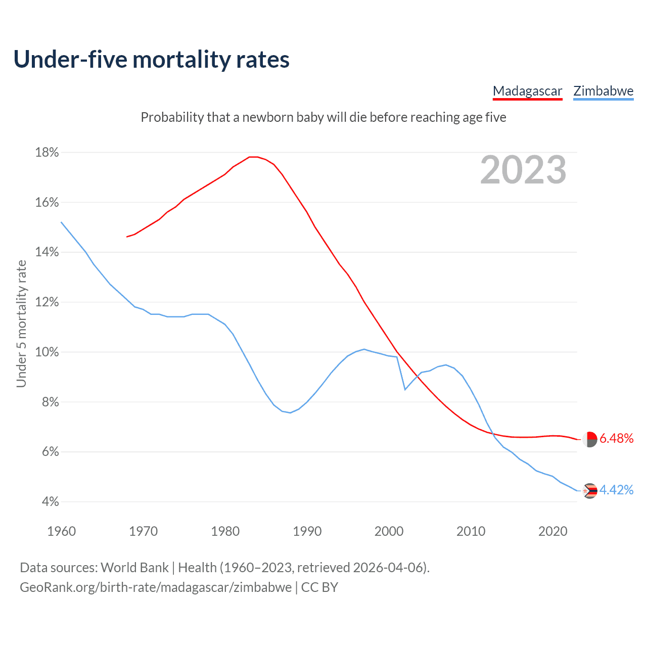 The chance that a newborn baby will die before reaching age five is 6.48% in Madagascar and 4.42% in Zimbabwe. Above is a chart with historical data on under-five mortality rates.