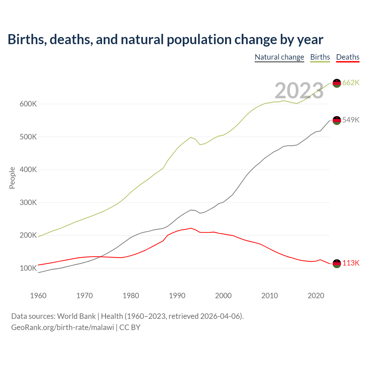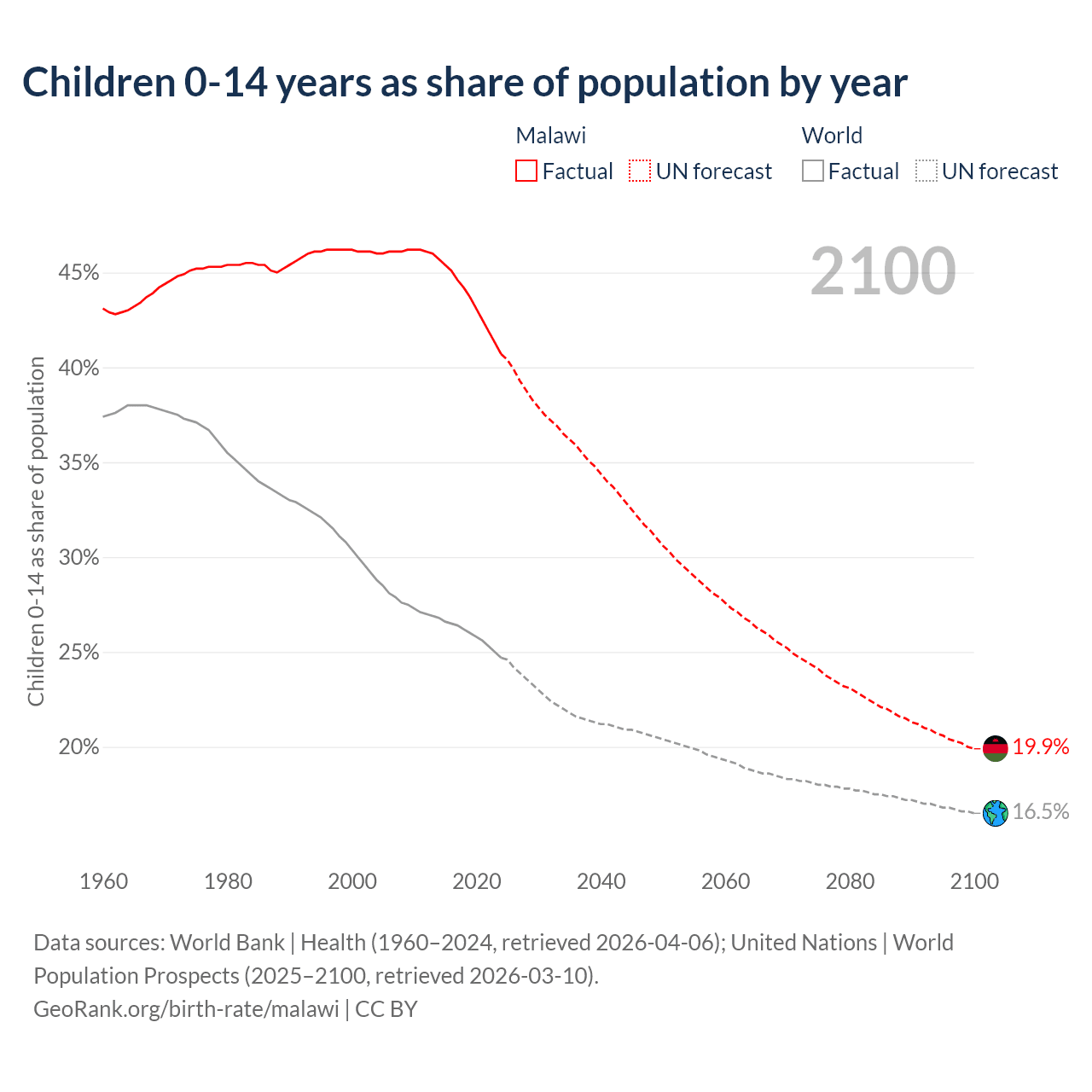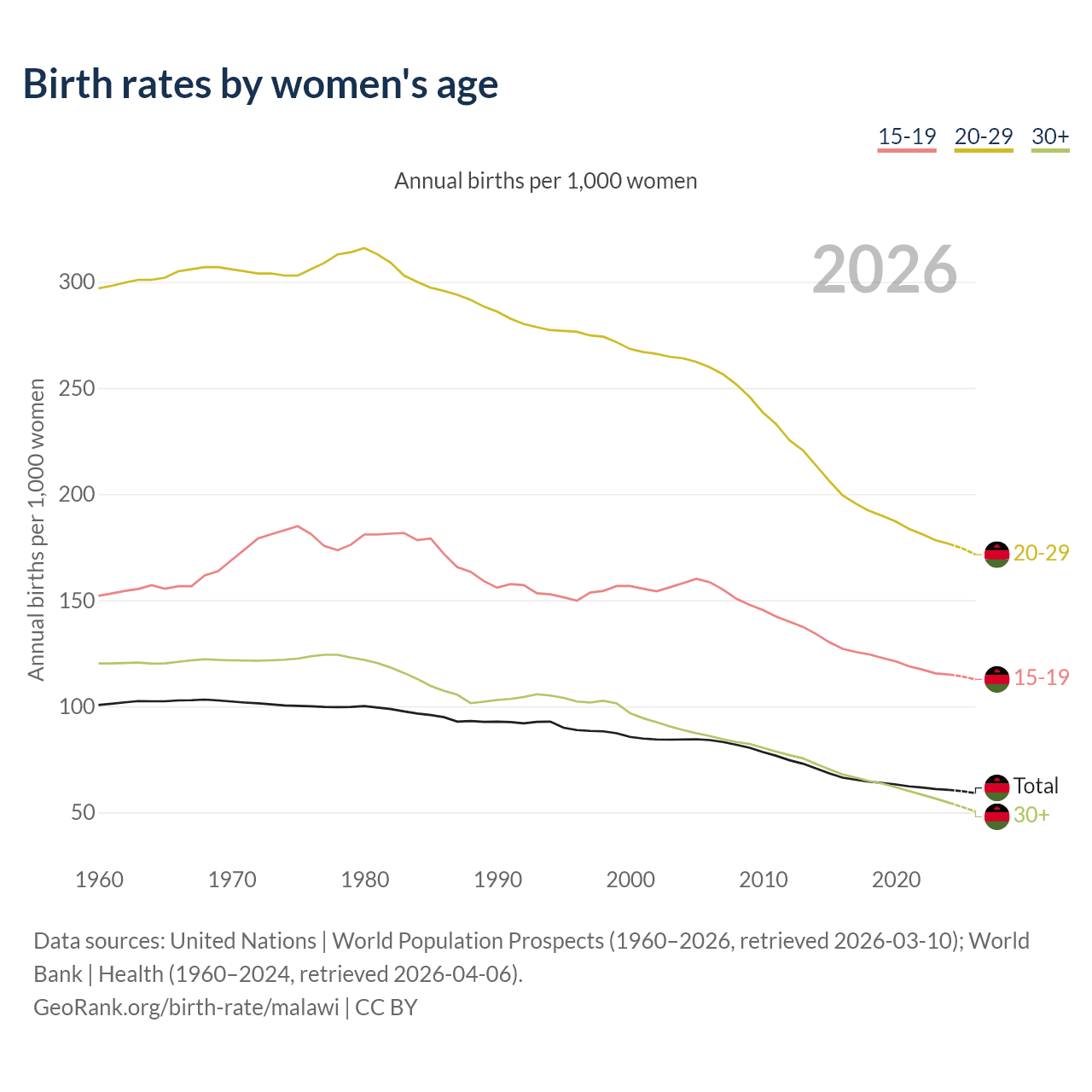Malawi has a birth rate of 31.4 (annual births per 1,000 people) and a fertility rate of 3.65 (the average number of children a woman is expected to have over her lifetime based on current age-specific birth rates).