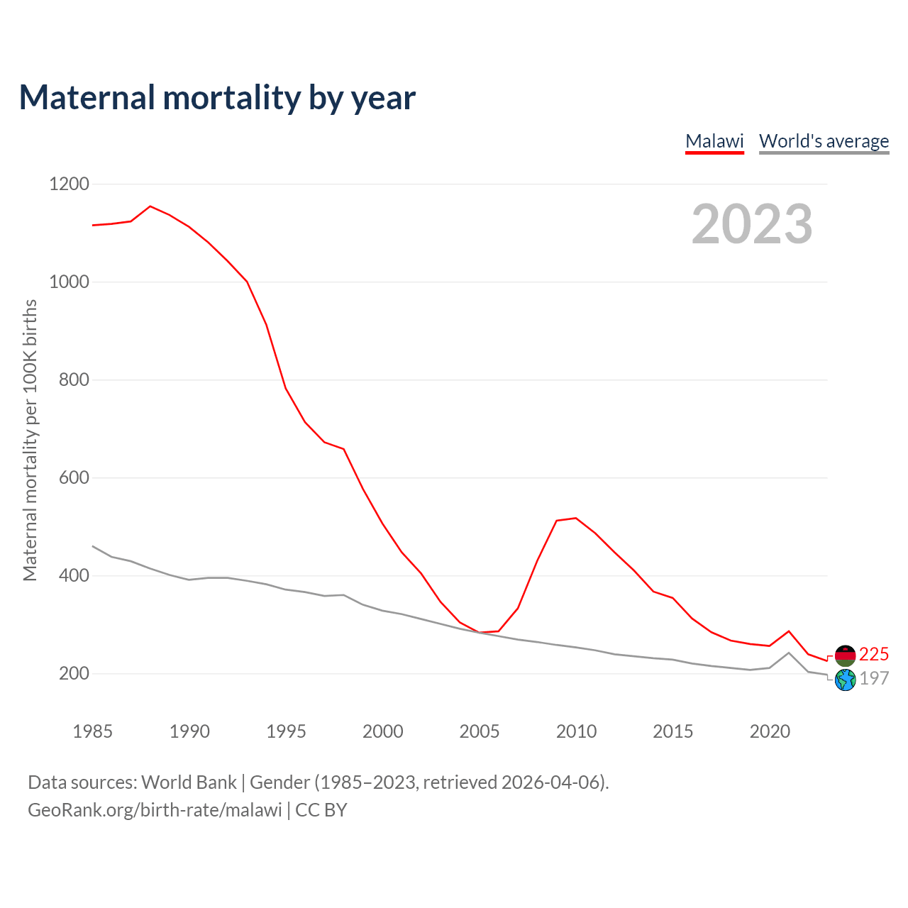 The maternal mortality rate in Malawi was 225 deaths per 100,000 live births in 2023 — a 0.23% chance of dying during childbirth or within 42 days of pregnancy termination. This is a 55.5% decrease compared to the year 2000.