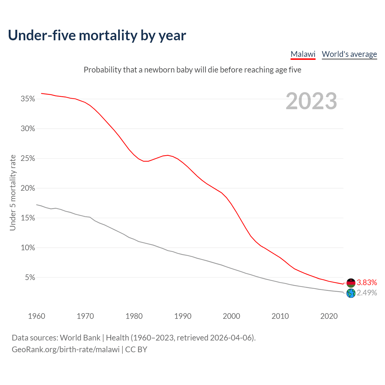 The under-5 mortality rate in Malawi was 38.3 deaths per 1,000 live births in 2023 — a 3.83% chance that a newborn baby will die before reaching age five. This is down from 173.3 deaths per 1,000 live births in 2000.