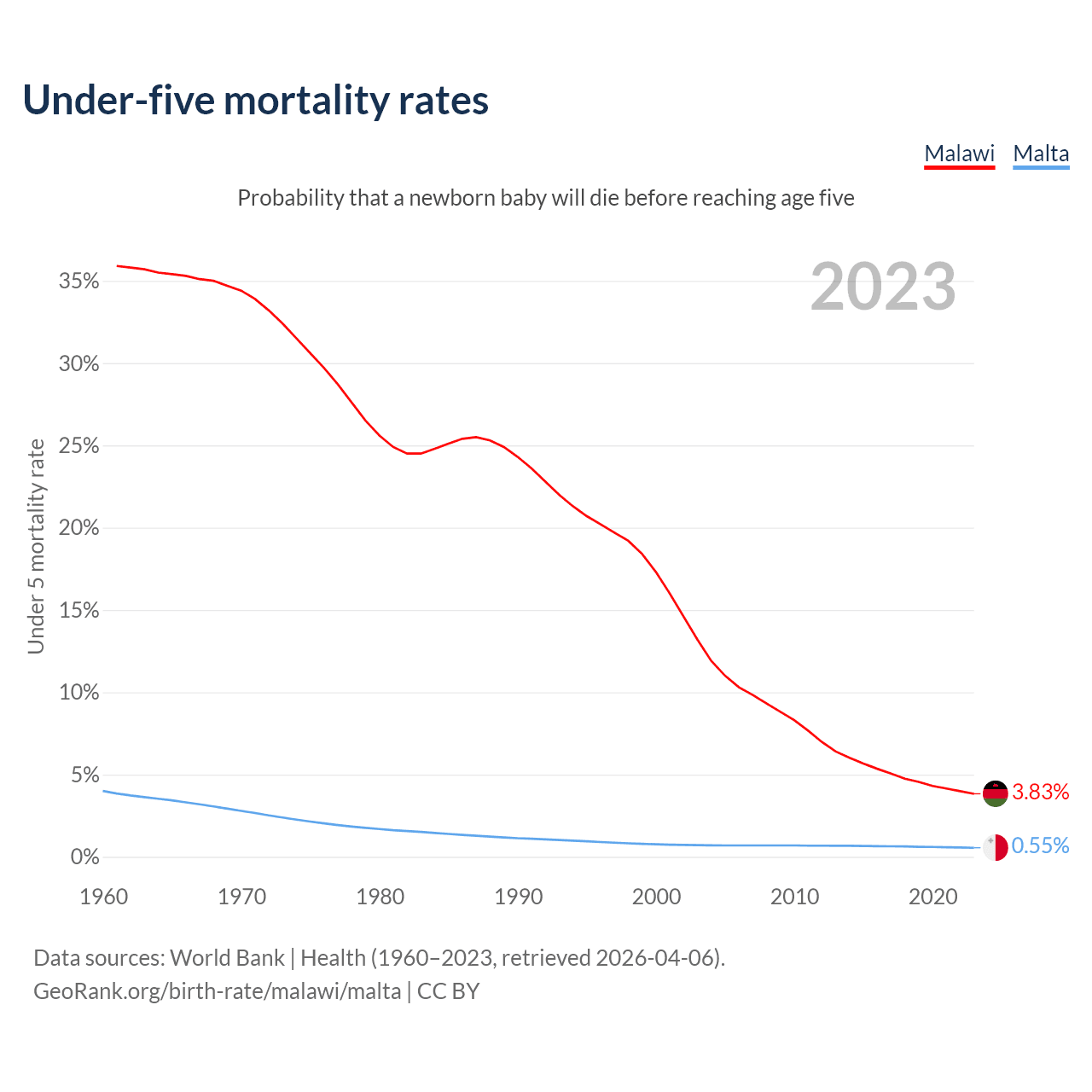 The chance that a newborn baby will die before reaching age five is 3.83% in Malawi and 0.55% in Malta. Above is a chart with historical data on under-five mortality rates.
