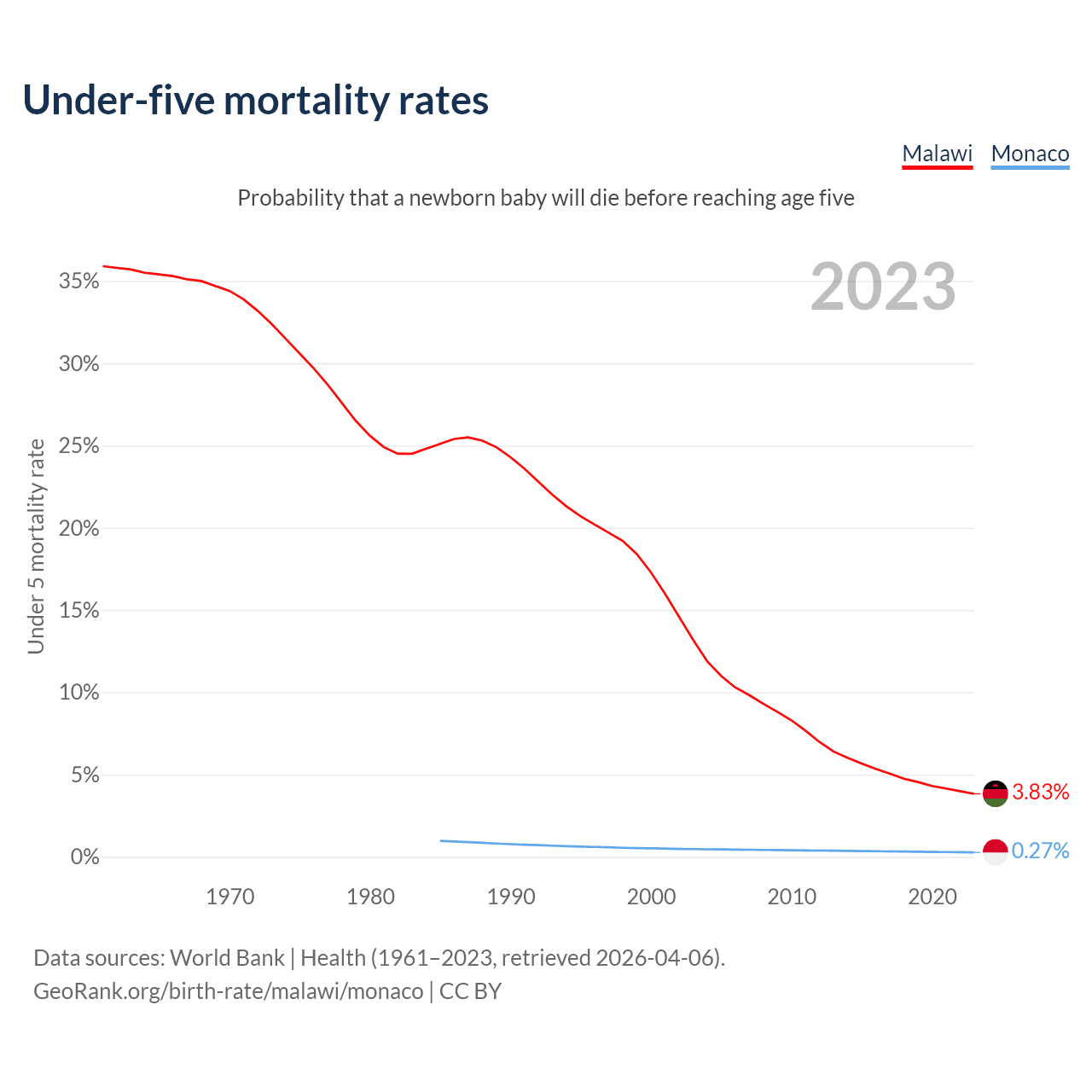 The chance that a newborn baby will die before reaching age five is 3.83% in Malawi and 0.27% in Monaco. Above is a chart with historical data on under-five mortality rates.