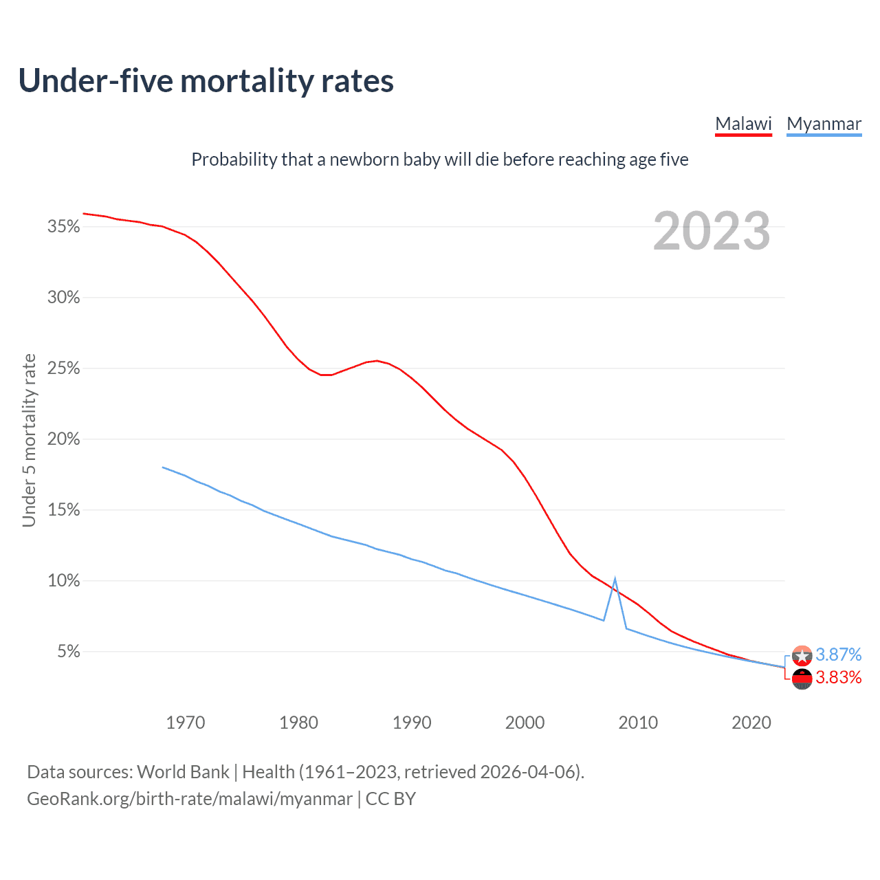 The chance that a newborn baby will die before reaching age five is 3.83% in Malawi and 3.87% in Myanmar. Above is a chart with historical data on under-five mortality rates.