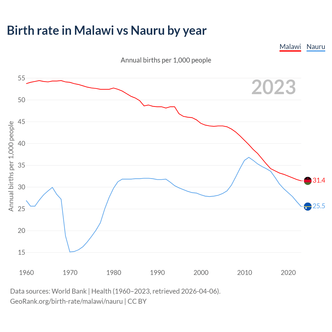 Malawi has an annual birth rate of 31.4 births per 1,000 people, compared to 25.5 for Nauru. The average number of children a woman is expected to have during her lifetime — the fertility rate, is 3.65 in Malawi and 3.33 in Nauru — 8.69% difference.