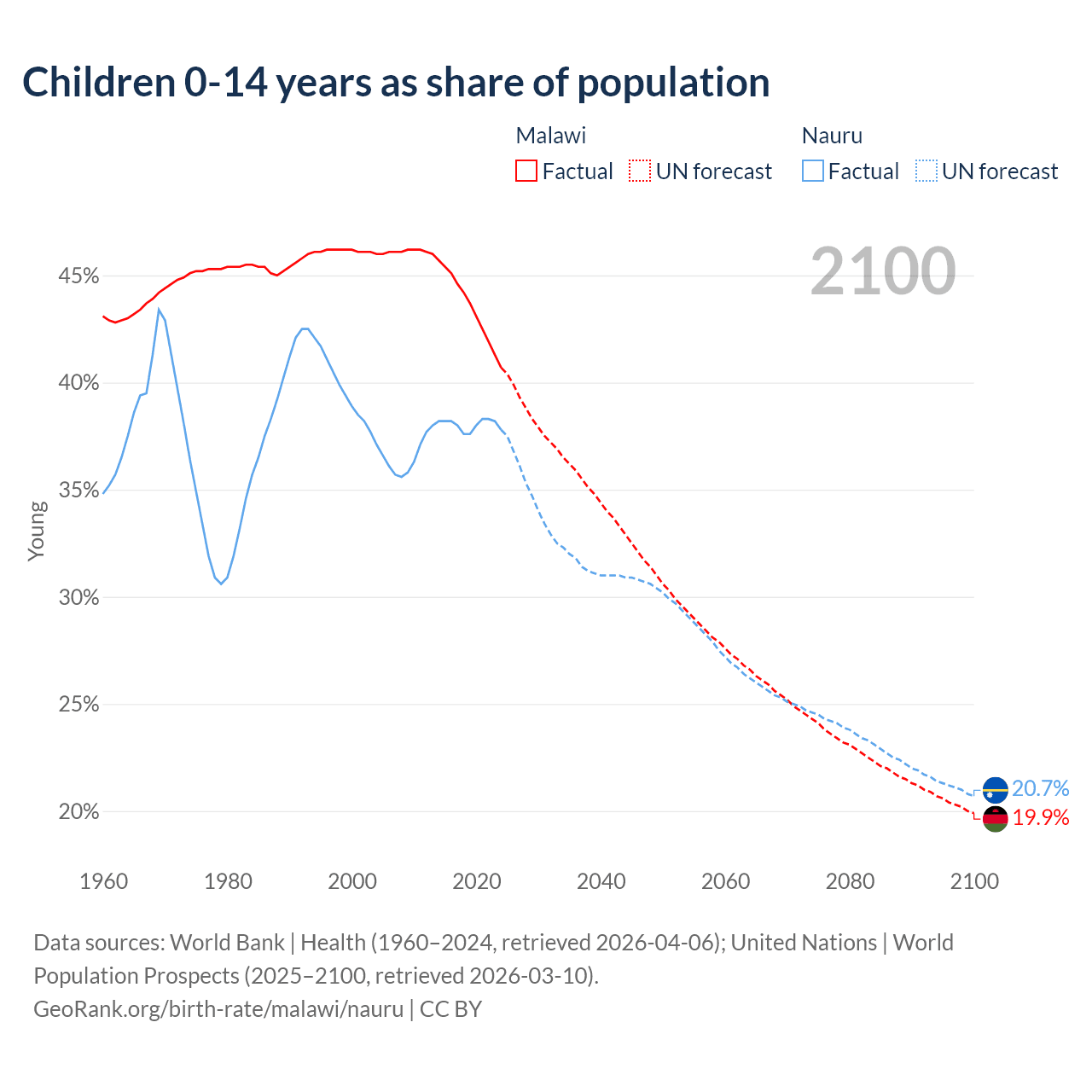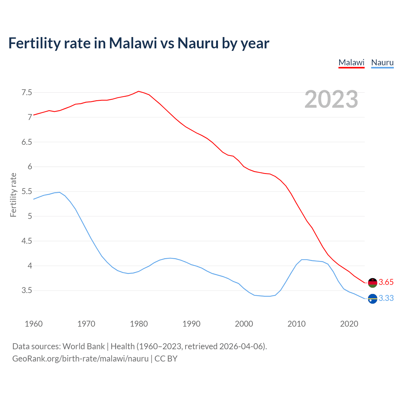 According to the latest available data on birth rates, the fertility rate in Malawi was 3.65 children per woman in 2023, compared to 3.33 in Nauru in 2023. The replacement level is considered to be 2.1 children per woman.
