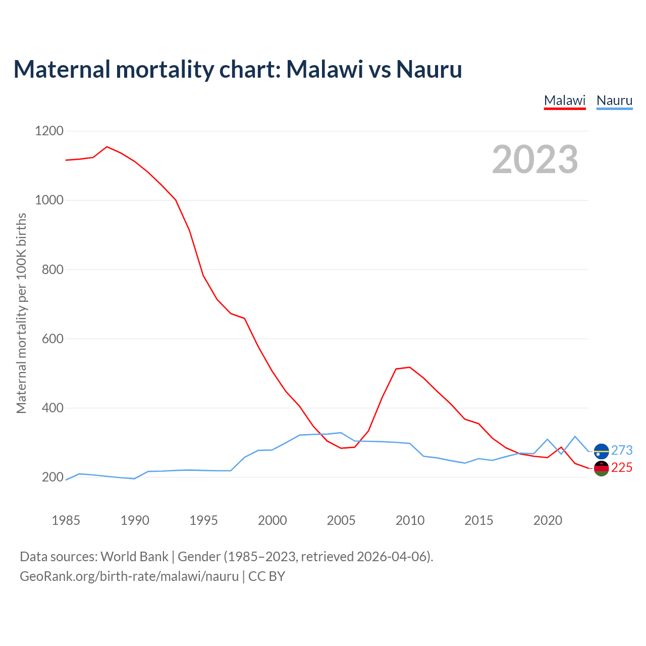 The maternal mortality rate, which is the probability of dying during childbirth or within 42 days of pregnancy termination, is 225 deaths per 100,000 live births in Malawi, compared to 273 deaths in Nauru.