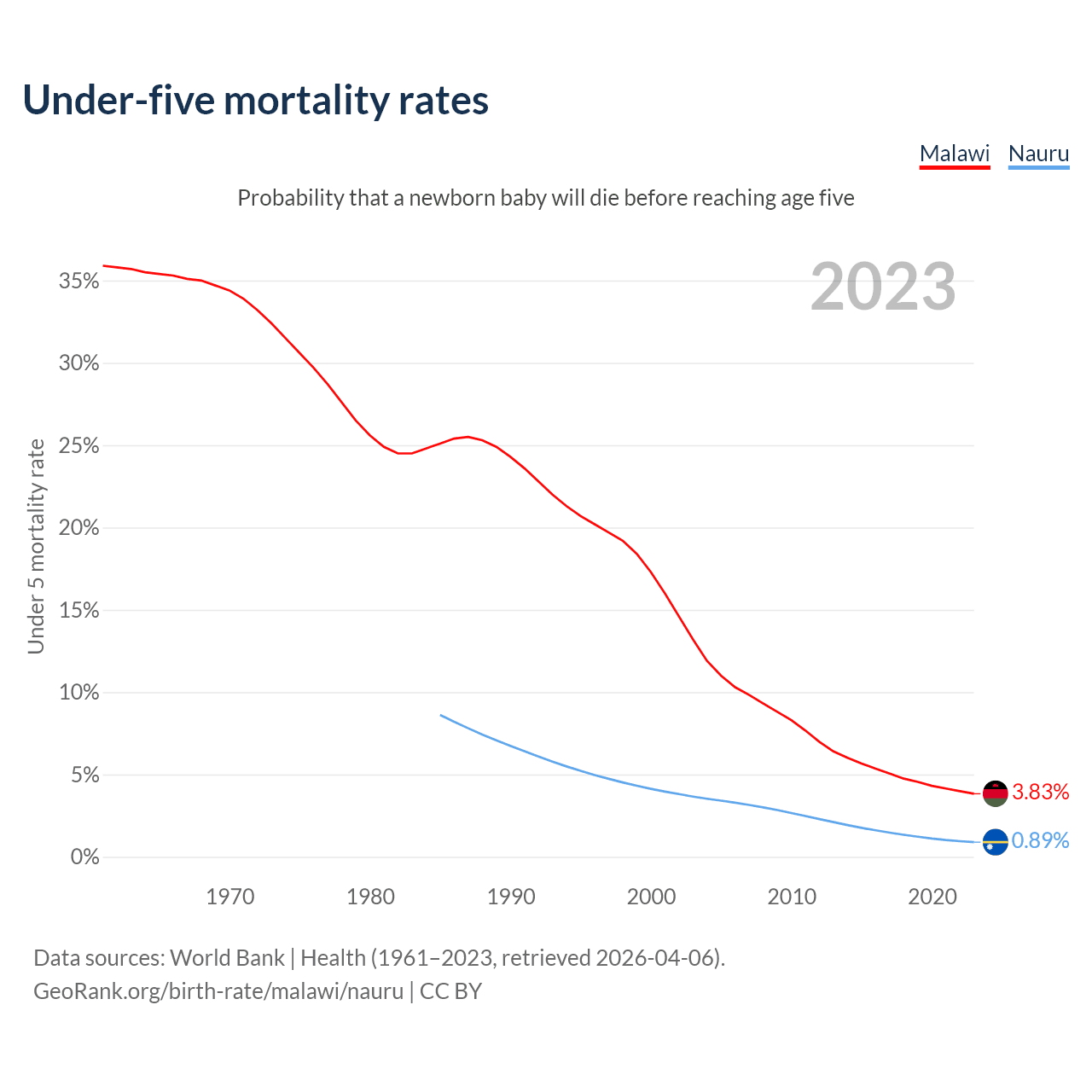 The chance that a newborn baby will die before reaching age five is 3.83% in Malawi and 0.89% in Nauru. Above is a chart with historical data on under-five mortality rates.