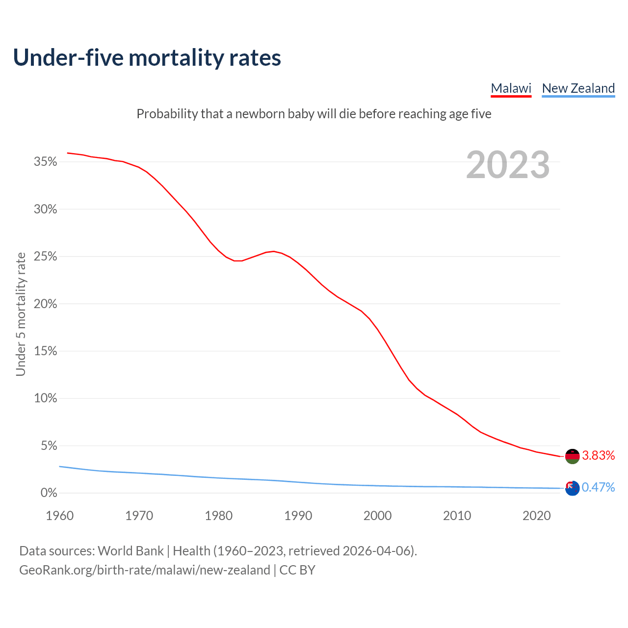 The chance that a newborn baby will die before reaching age five is 3.83% in Malawi and 0.47% in New Zealand. Above is a chart with historical data on under-five mortality rates.