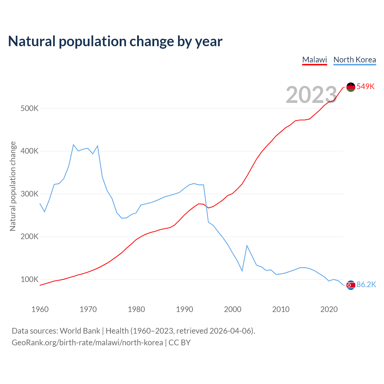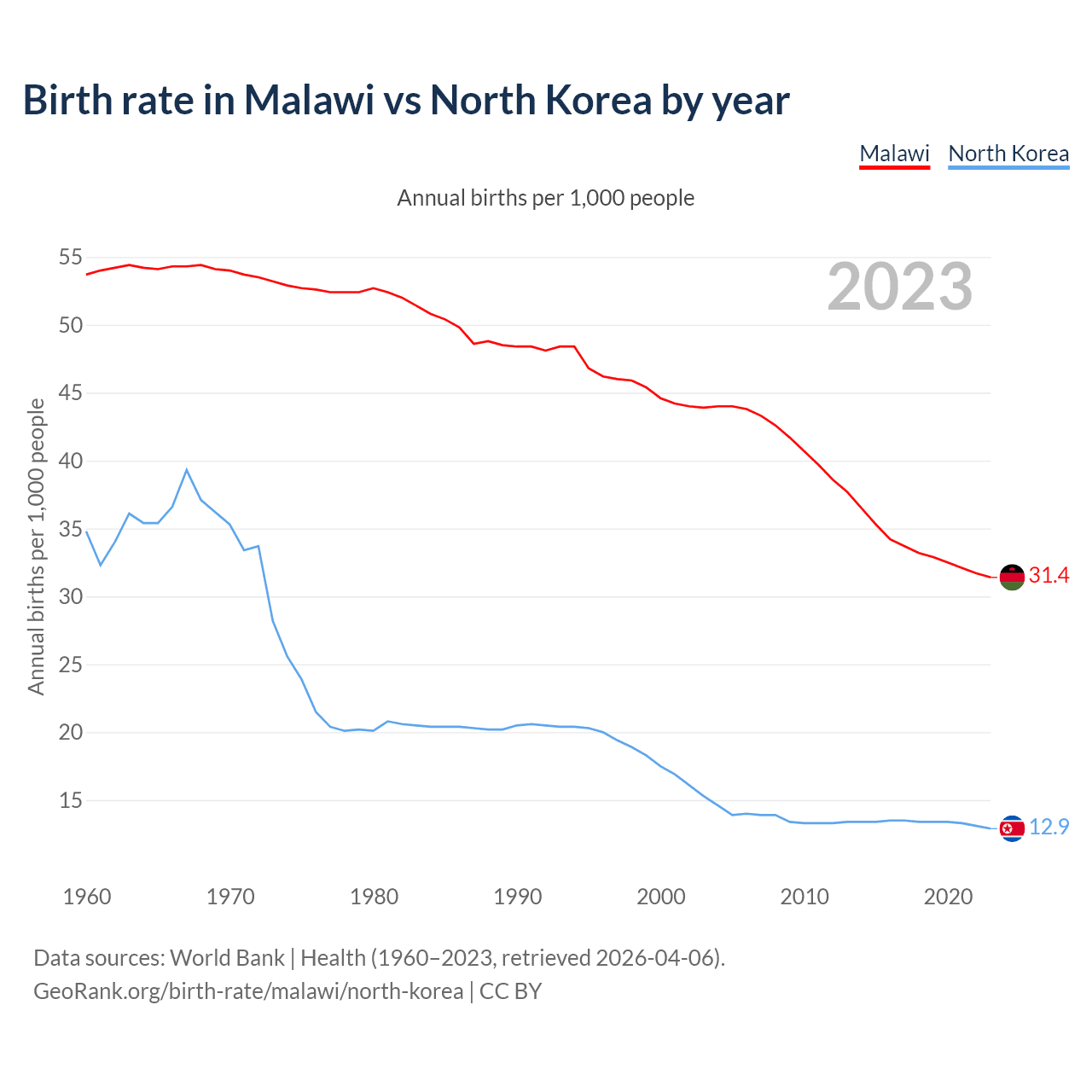 Malawi has an annual birth rate of 31.4 births per 1,000 people, compared to 12.9 for North Korea. The average number of children a woman is expected to have during her lifetime — the fertility rate, is 3.65 in Malawi and 1.78 in North Korea — 51.2% difference.