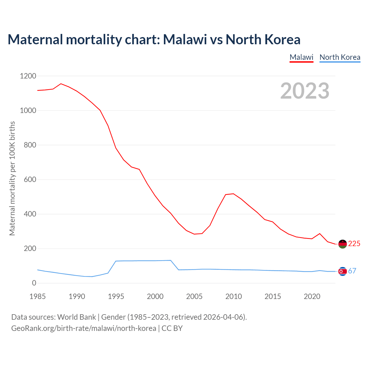 The maternal mortality rate, which is the probability of dying during childbirth or within 42 days of pregnancy termination, is 225 deaths per 100,000 live births in Malawi, compared to 67 deaths in North Korea.