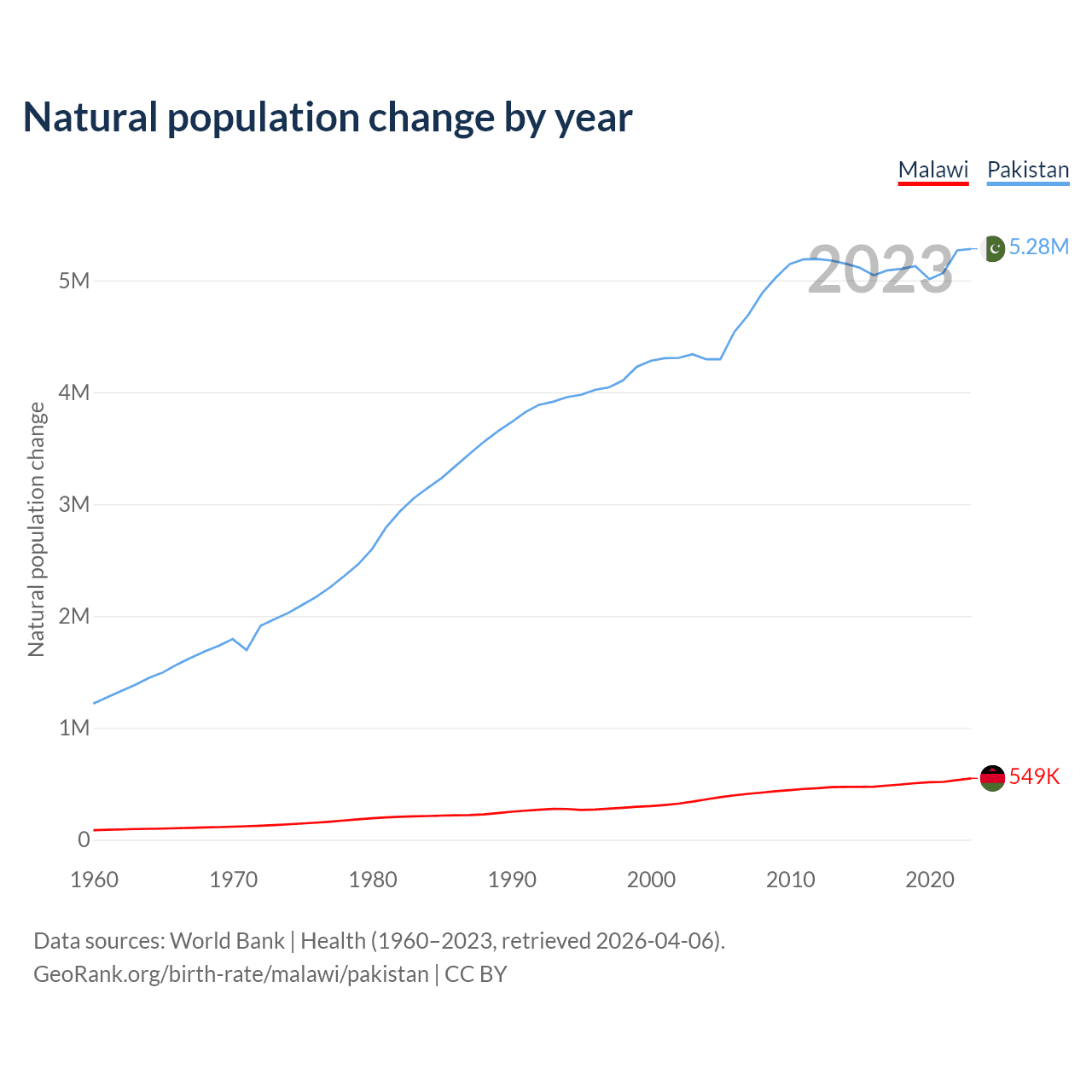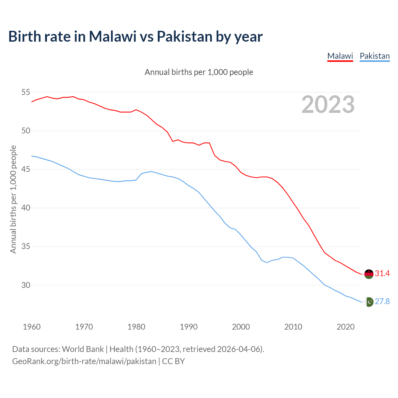 Malawi has an annual birth rate of 31.4 births per 1,000 people, compared to 27.8 for Pakistan. The average number of children a woman is expected to have during her lifetime — the fertility rate, is 3.65 in Malawi and 3.61 in Pakistan — 1.18% difference.