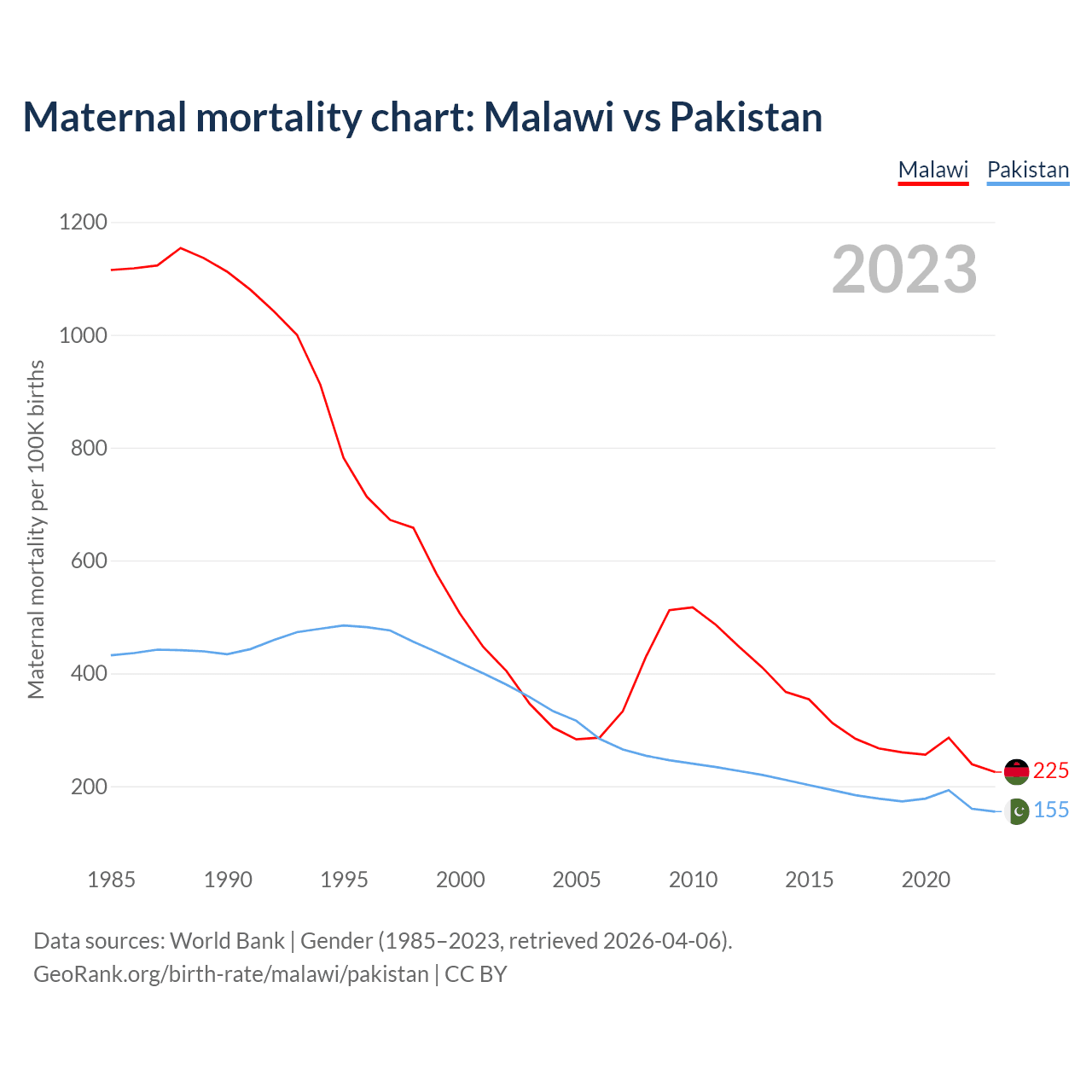 The maternal mortality rate, which is the probability of dying during childbirth or within 42 days of pregnancy termination, is 225 deaths per 100,000 live births in Malawi, compared to 155 deaths in Pakistan.