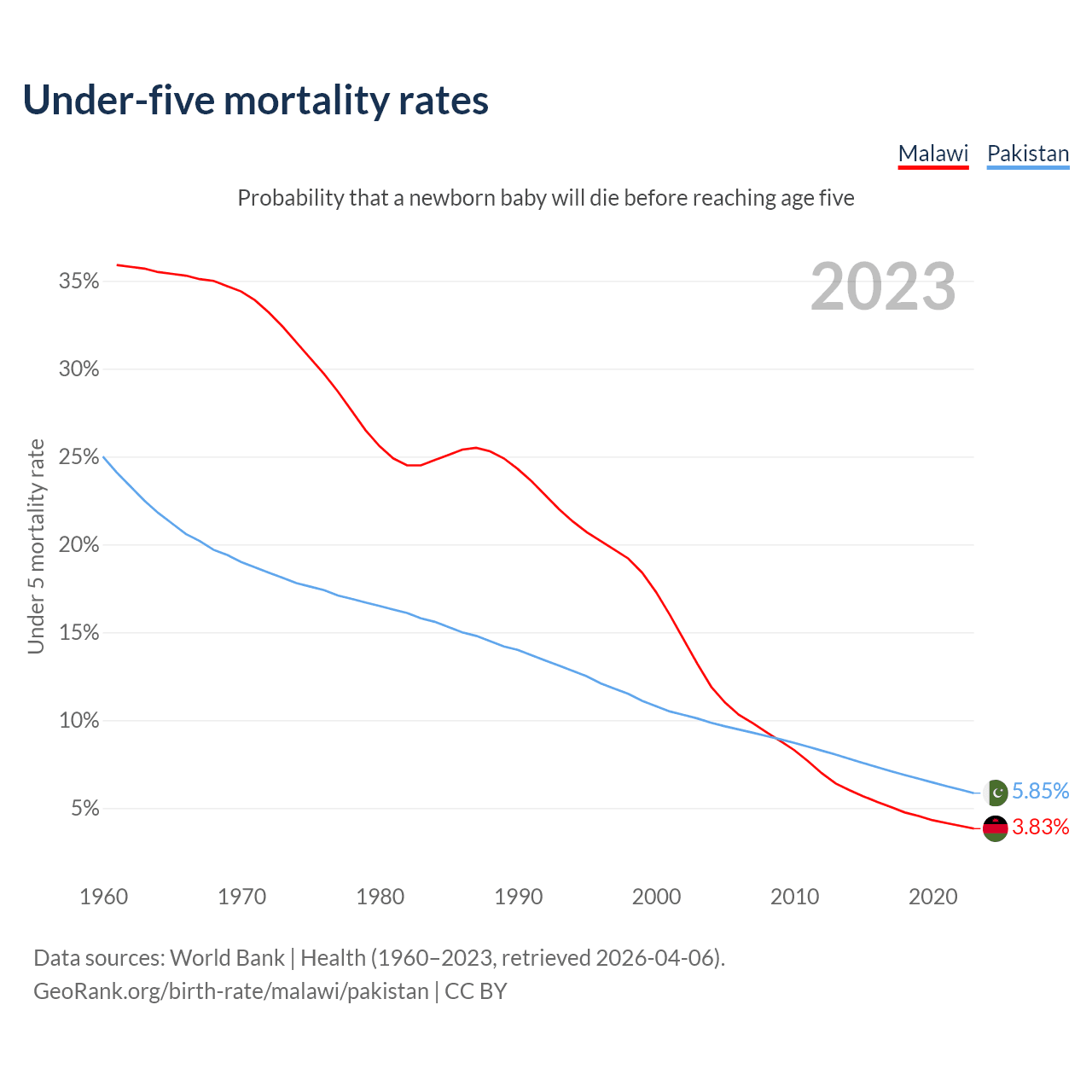 The chance that a newborn baby will die before reaching age five is 3.83% in Malawi and 5.85% in Pakistan. Above is a chart with historical data on under-five mortality rates.