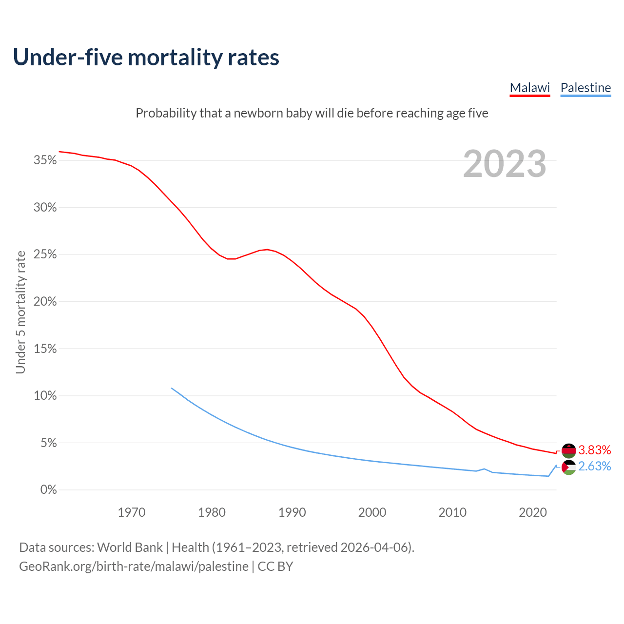 The chance that a newborn baby will die before reaching age five is 3.83% in Malawi and 2.63% in Palestine. Above is a chart with historical data on under-five mortality rates.