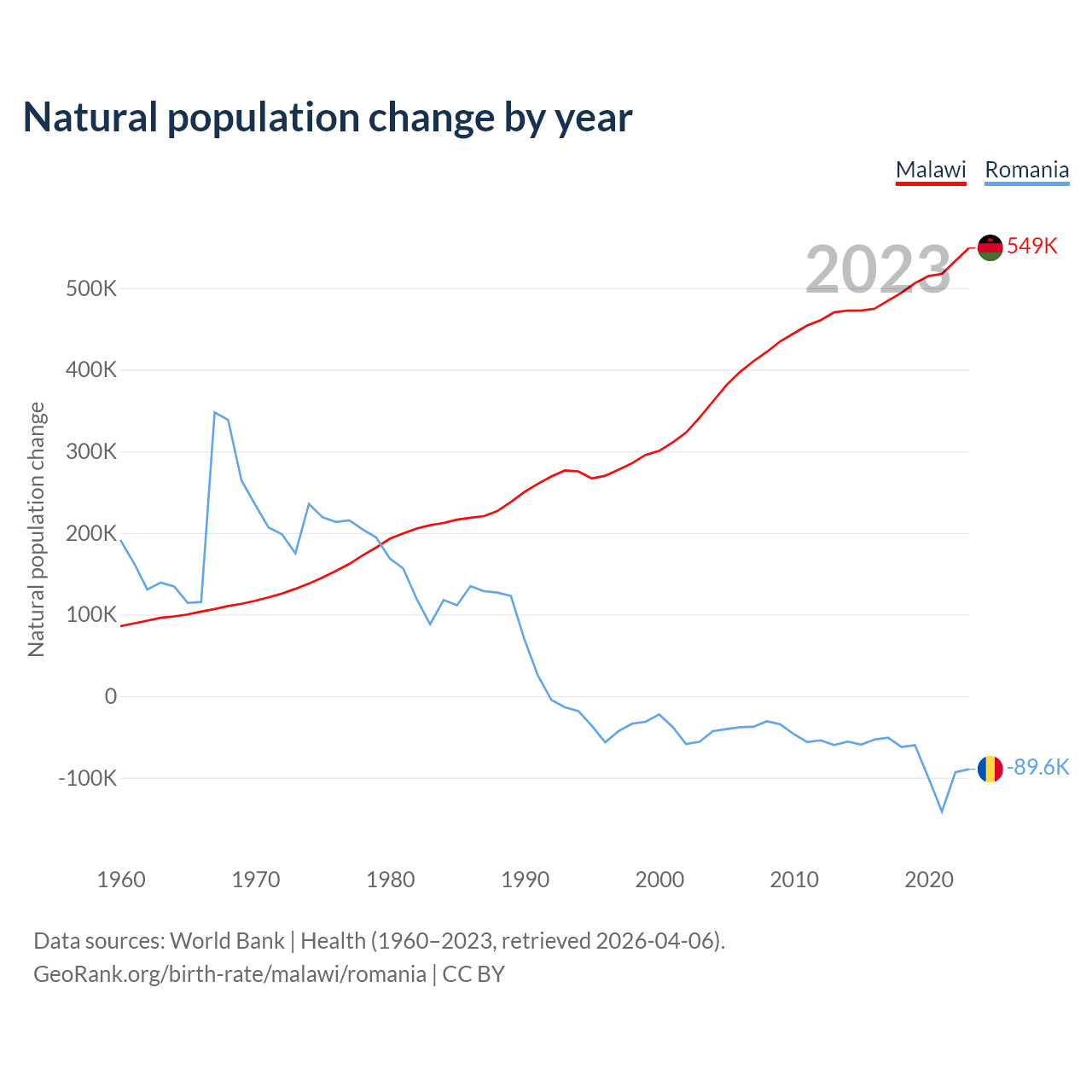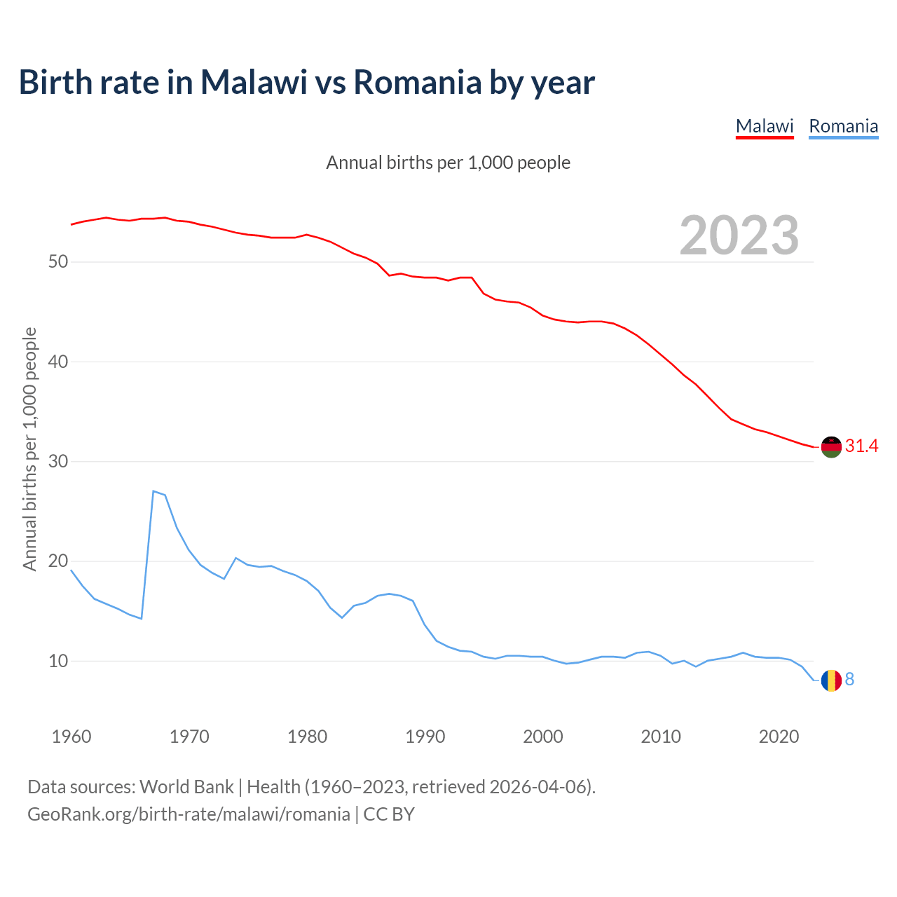 Malawi has an annual birth rate of 31.4 births per 1,000 people, compared to 8 for Romania. The average number of children a woman is expected to have during her lifetime — the fertility rate, is 3.65 in Malawi and 1.71 in Romania — 53.1% difference.