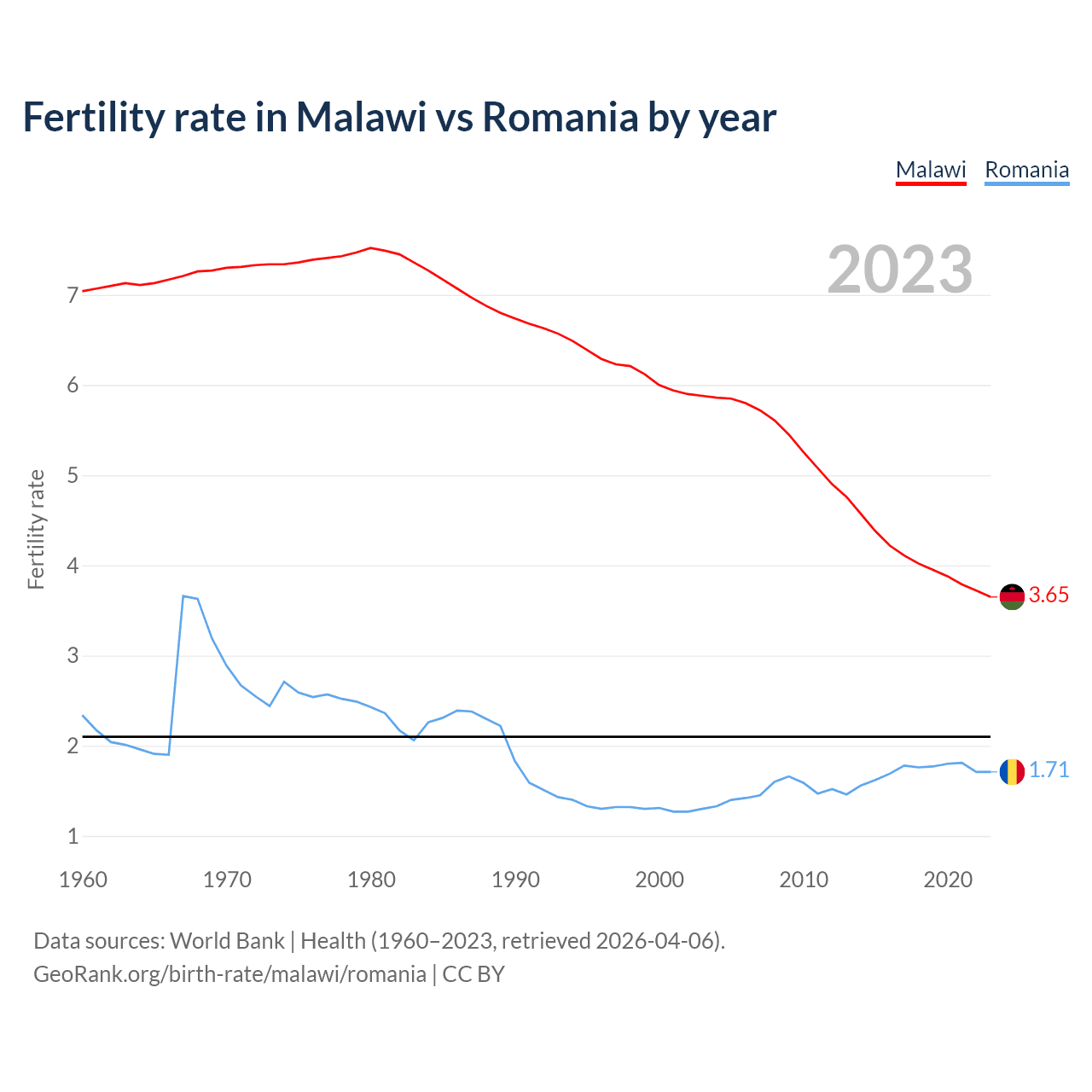 According to the latest available data on birth rates, the fertility rate in Malawi was 3.65 children per woman in 2023, compared to 1.71 in Romania in 2023. The replacement level is considered to be 2.1 children per woman.
