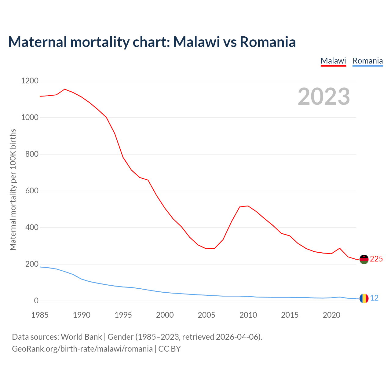 The maternal mortality rate, which is the probability of dying during childbirth or within 42 days of pregnancy termination, is 225 deaths per 100,000 live births in Malawi, compared to 12 deaths in Romania.
