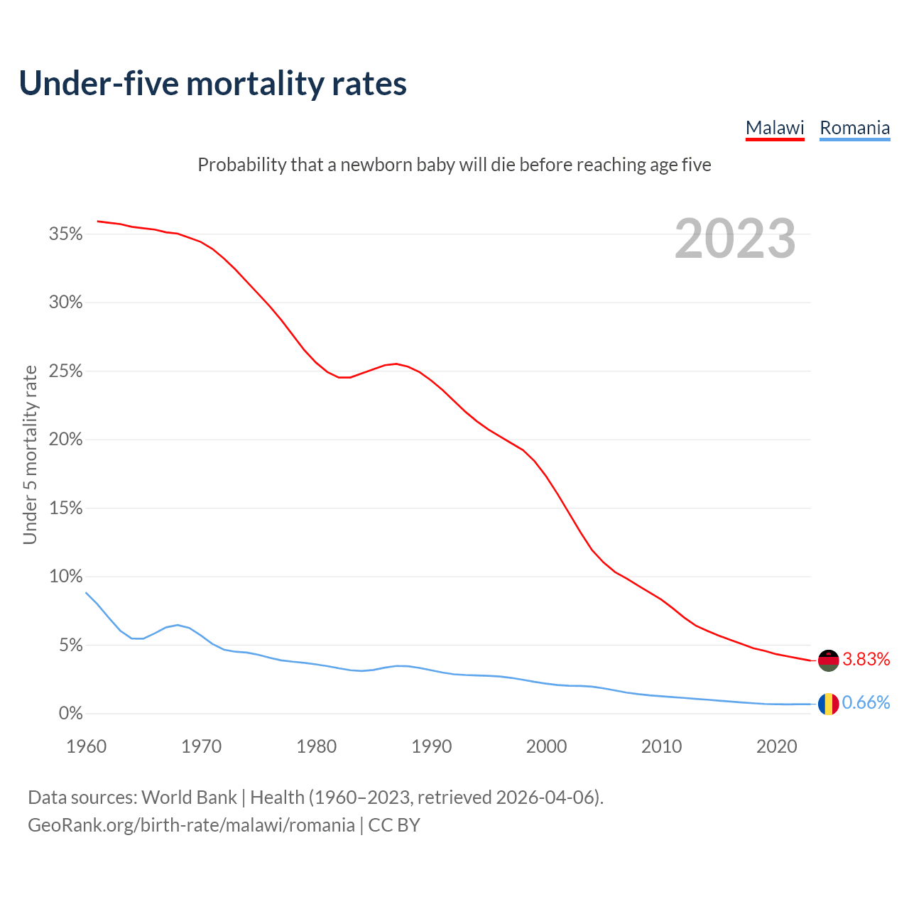 The chance that a newborn baby will die before reaching age five is 3.83% in Malawi and 0.66% in Romania. Above is a chart with historical data on under-five mortality rates.