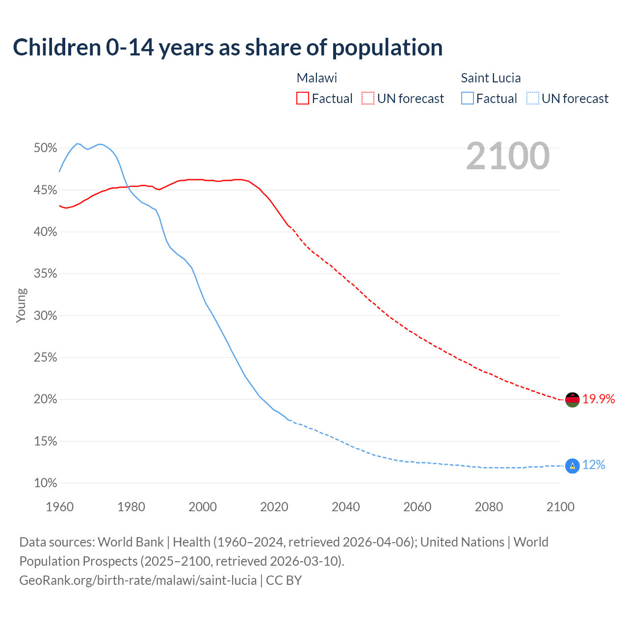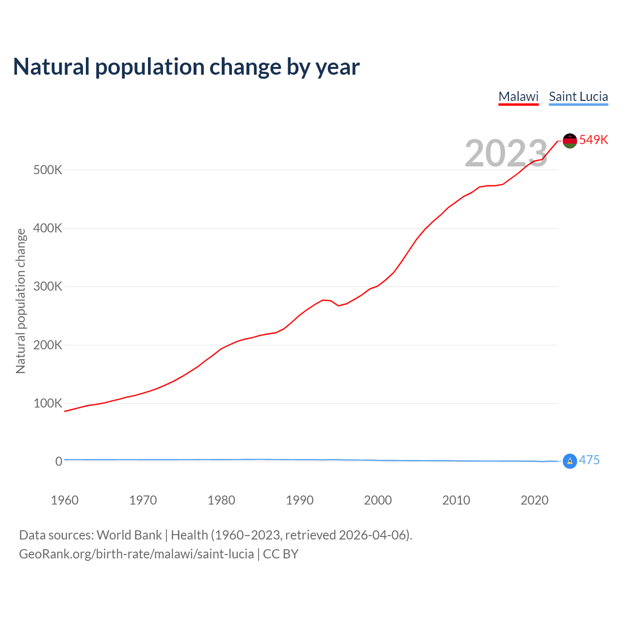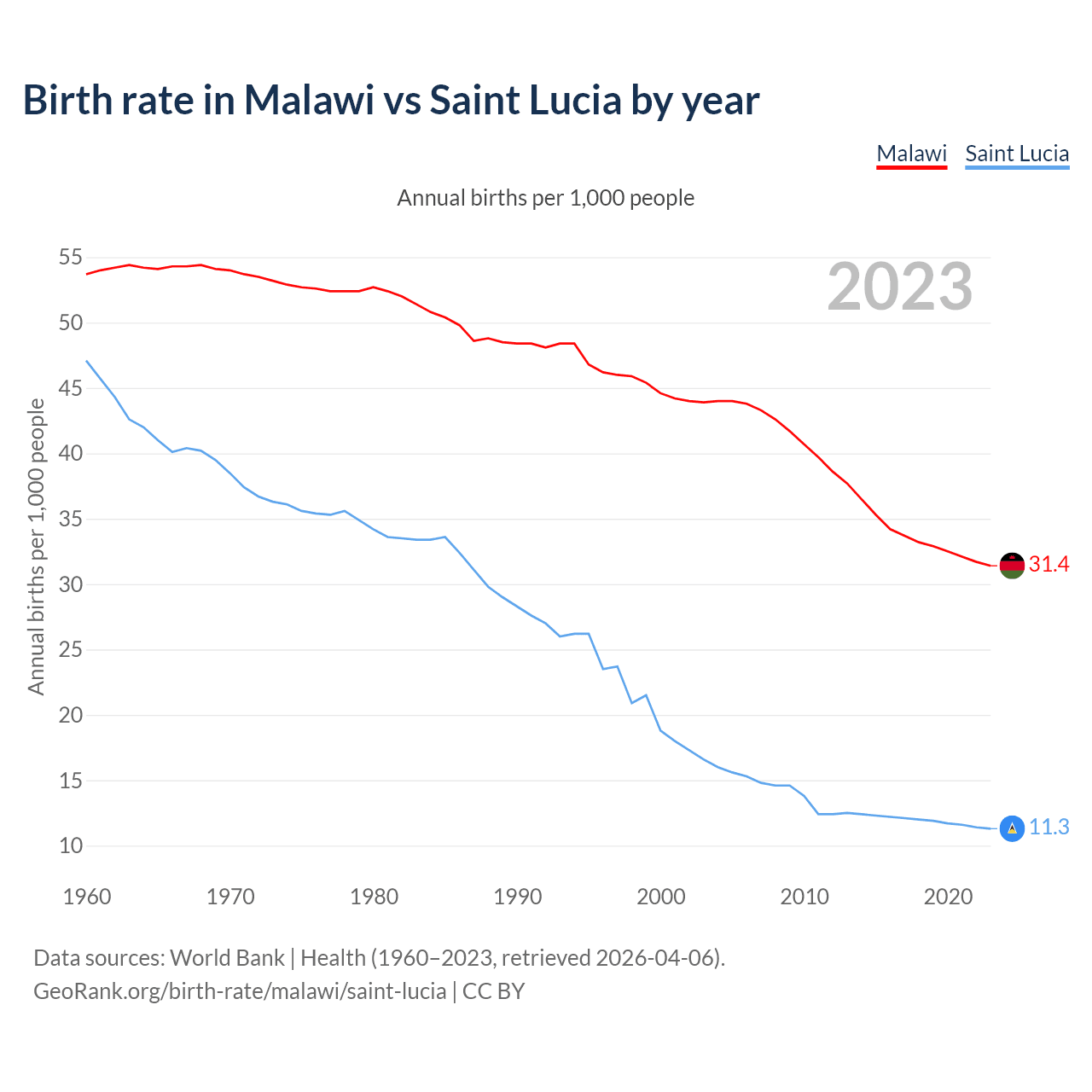 Malawi has an annual birth rate of 31.4 births per 1,000 people, compared to 11.3 for Saint Lucia. The average number of children a woman is expected to have during her lifetime — the fertility rate, is 3.65 in Malawi and 1.38 in Saint Lucia — 62.2% difference.