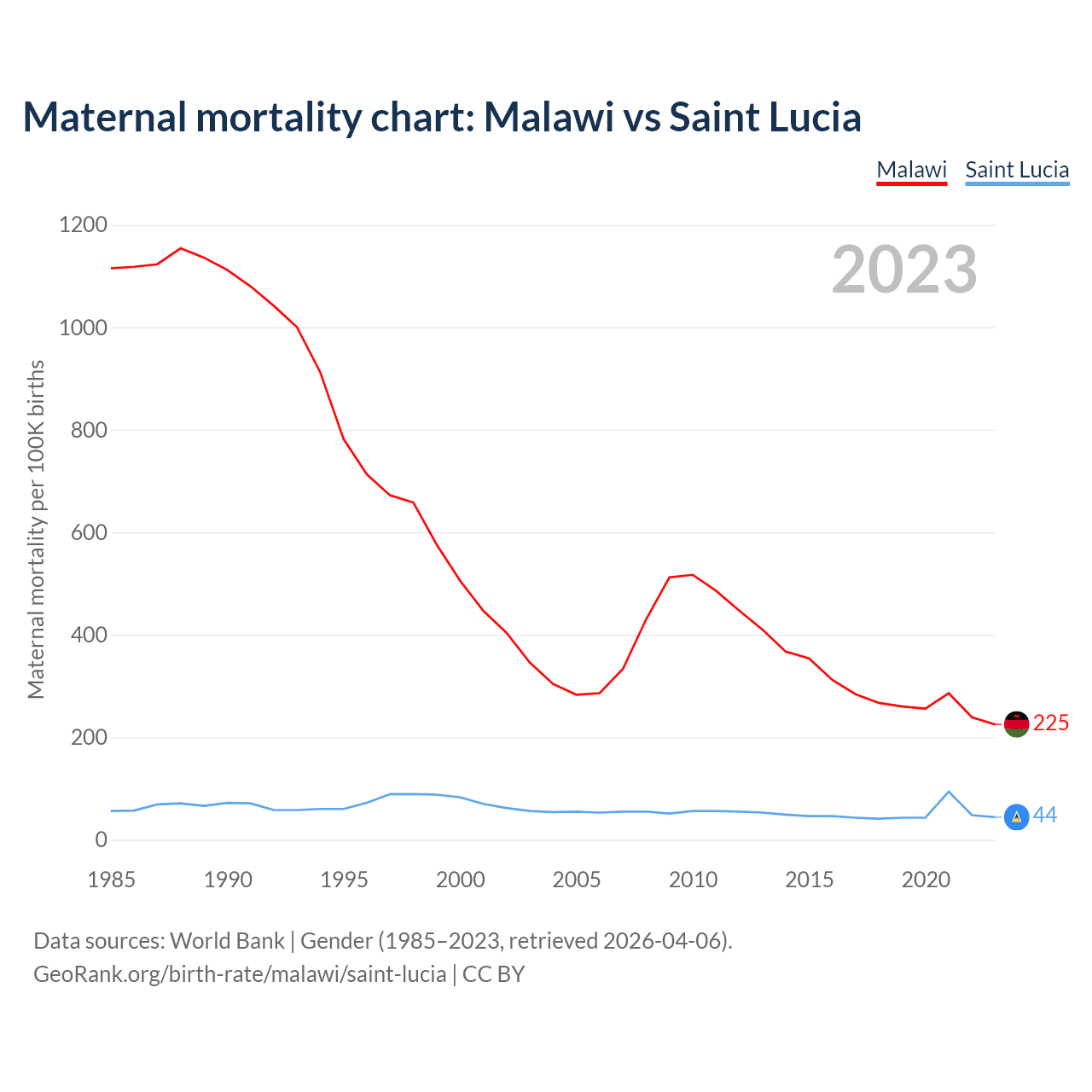 The maternal mortality rate, which is the probability of dying during childbirth or within 42 days of pregnancy termination, is 225 deaths per 100,000 live births in Malawi, compared to 44 deaths in Saint Lucia.