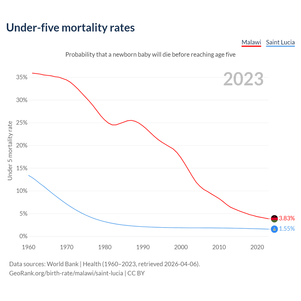 The chance that a newborn baby will die before reaching age five is 3.83% in Malawi and 1.55% in Saint Lucia. Above is a chart with historical data on under-five mortality rates.